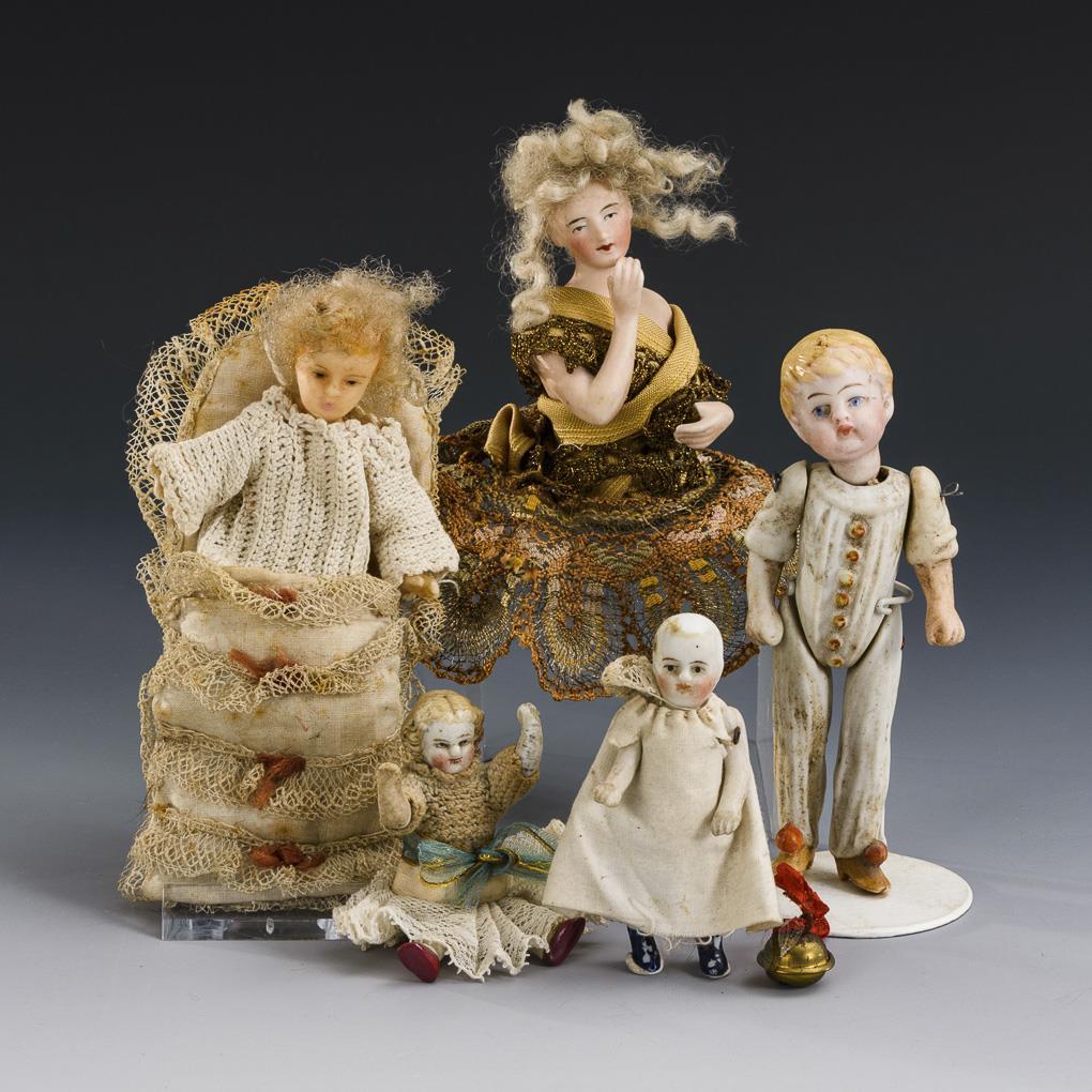 Teepuppen-Büste und 4 Puppenstuben-Püppchen.