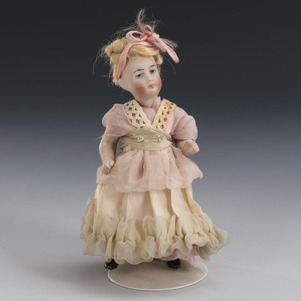 4 Ganzbiskuit-Püppchen mit gemalten Augen, blonden Mohairhaaren und modellierten Schuhen. 2x mit Kurbelkopf und alter Kleidung, 2x mit festem Kopf und Häkelkleid. 1 Fuß repariert, einige kleine Bestoßungen.