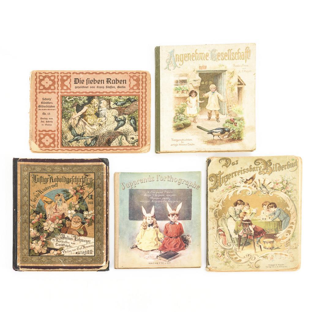 "Die sieben Raben", Scholz' Künstler-Bilderbuch Nr. 13. / Julius Lohmeyer: "Lustige Koboldgeschichten". / A.F. Meyer: "Angenehme Gesellschaft. Tiergeschichten für artige kleine Leute". / "Das unzerreissbare Bilderbuch". / H. S. Brés: "J'apprends l'orthographe" (Schulbuch in französischer Sprache). Alle mit starken Defekten.