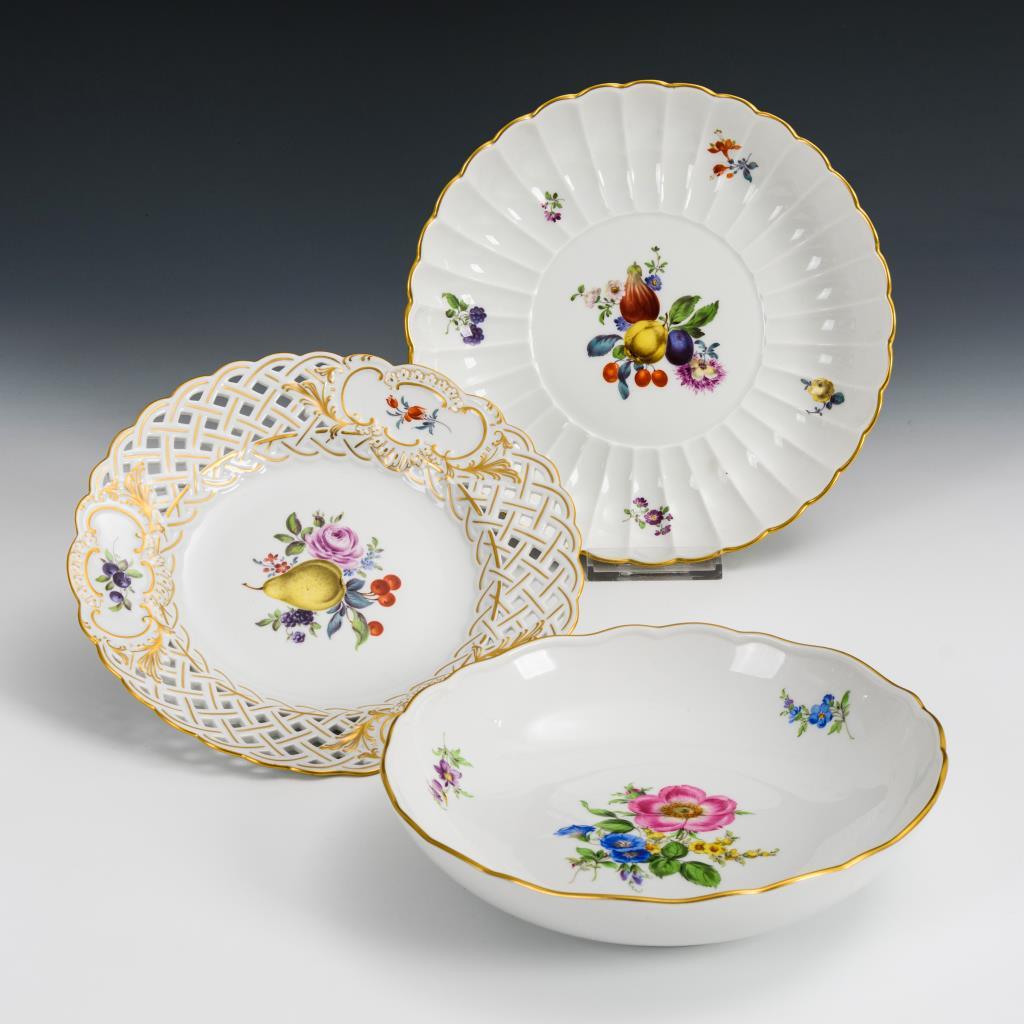 Schale mit Blumenmalerei, Fächerschale mit Blumen- und Fruchtmalerei sowie Durchbruchteller mit Blumen- und Fruchtmalerei.