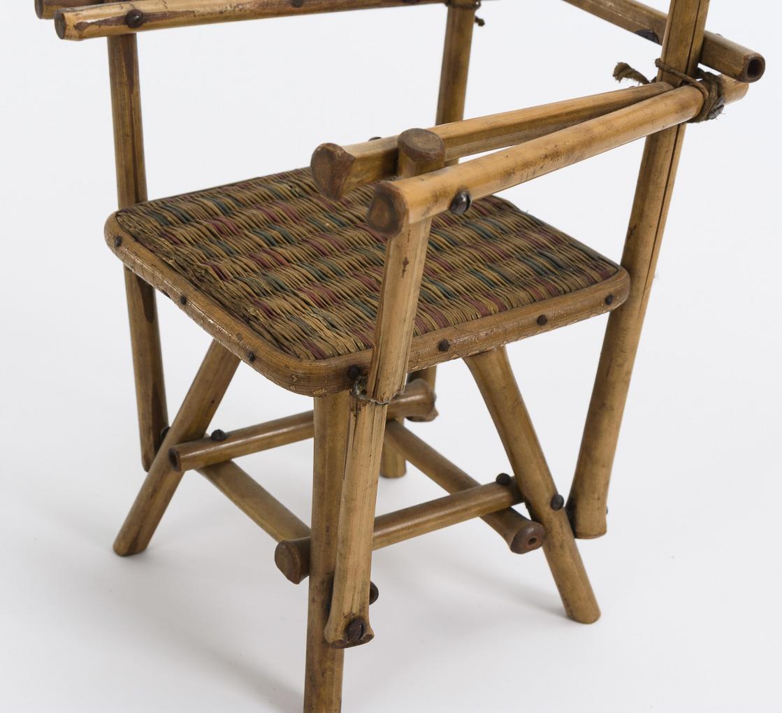 Verschiedene Stühle, darunter kleiner Korbsessel, Bambus-Stuhl und Louis-Philippe-Stuhl mit Geflecht. Mit Defekten.