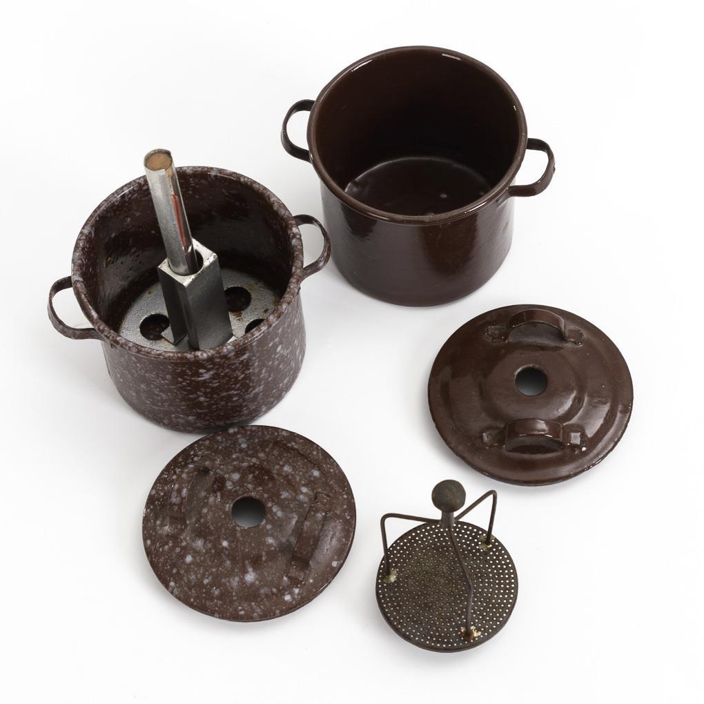 2 Einkochtöpfe, 4 Vorratsgläser und Puppen-Kochbuch.