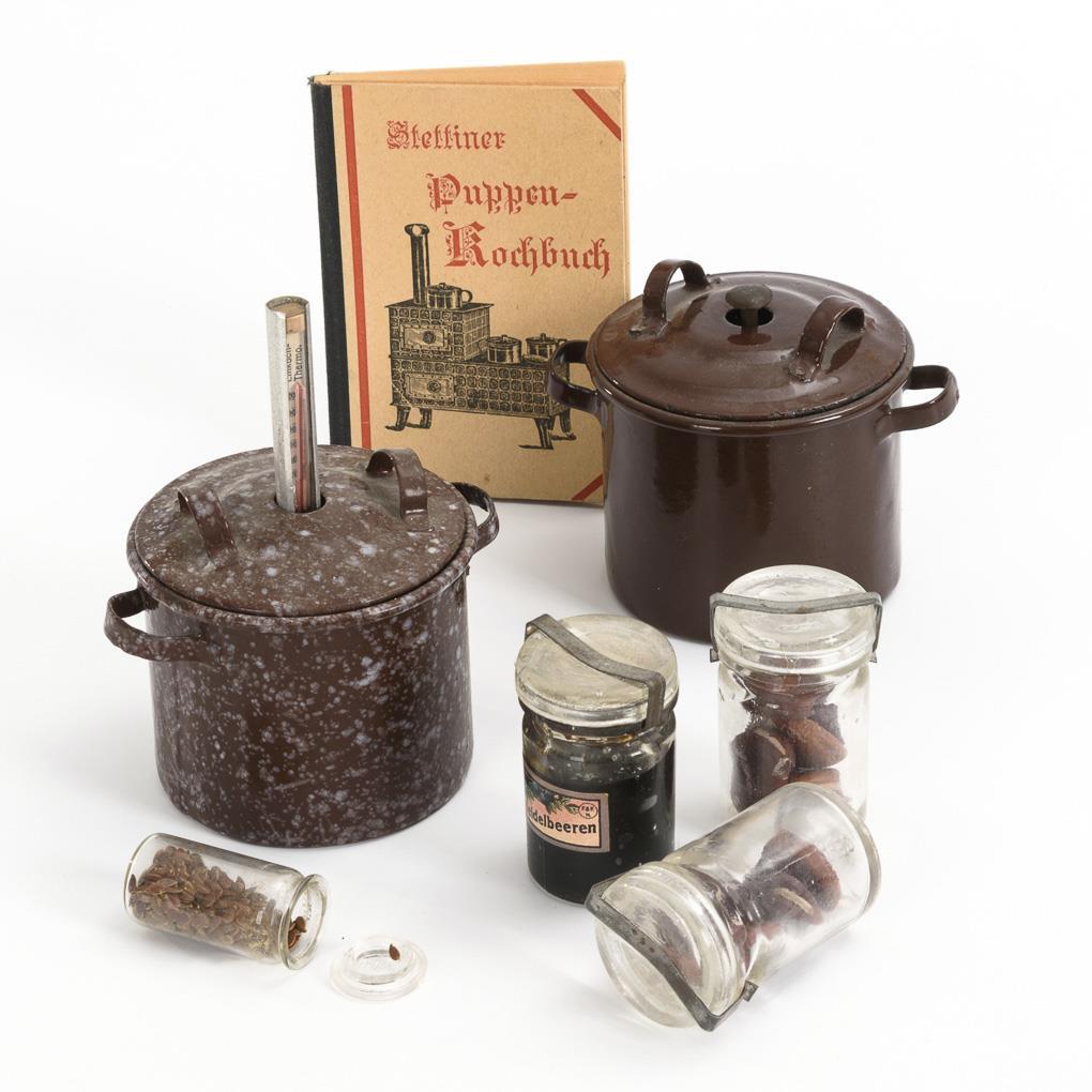 Für die Puppenküche: 2 Töpfe mit Einsatz und Thermometer, 3 Einmachgläser und 1 kleines Vorratsglas. Dazu "Stettiner Puppen-Kochbuch. Ueberreicht von Richard Braun, Stettin". Leichte Altersspuren.