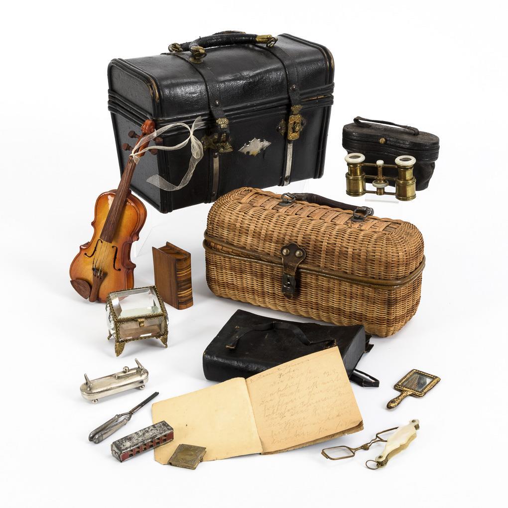 Schwarzer Henkelkoffer, länglicher Korb mit Griff, Schulranzen, Opernglas in Etui, Geige, Holzbuch mit Geheimfach und einige Teile Schreibtischzubehör in Puppengröße. Teils mit Altersspuren.
