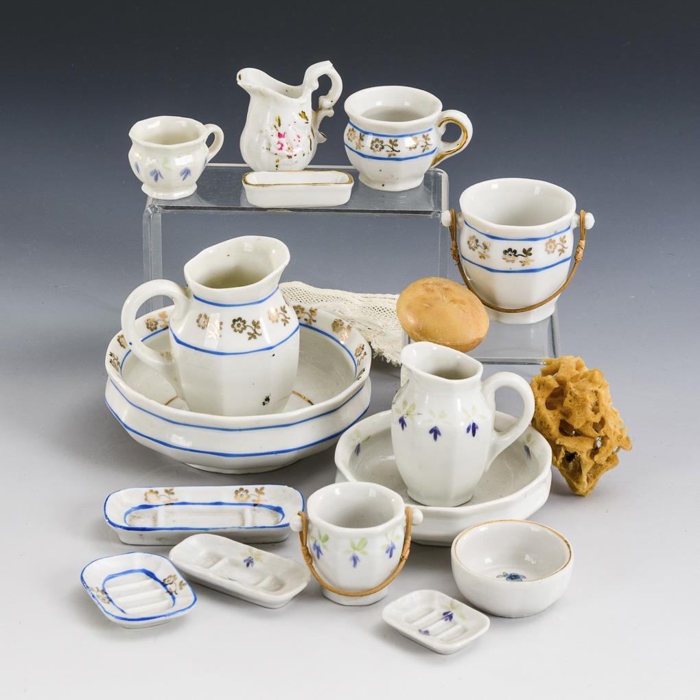 Ca. 15 Teile Porzellan aus 3 verschiedenen Waschgarnituren: Wasserkannen, Waschschüsseln, Seifenschalen etc. Dazu Seife, Schwamm und Handtuch. Teils berieben.