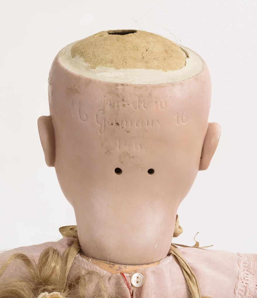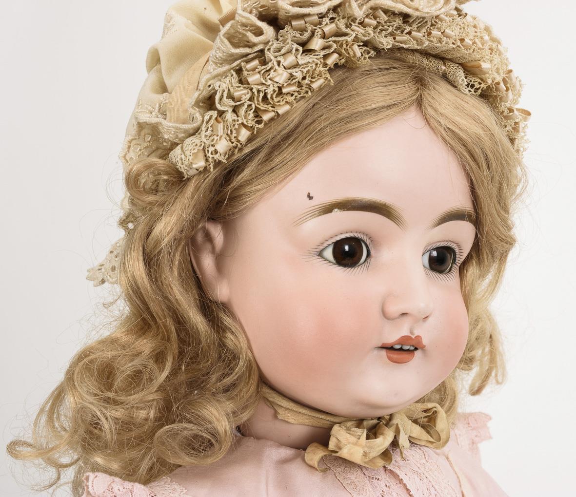 Kurbelkopf, braune Schlafaugen, blondgelockte Echthaarperücke. 15-teiliger Gliederkörper. Langes rosa Kleid, helle Haube, nachgenähte schwarze Schuhe. Kopf fachgerecht restauriert, Körper mit partiellem Farbabrieb.
