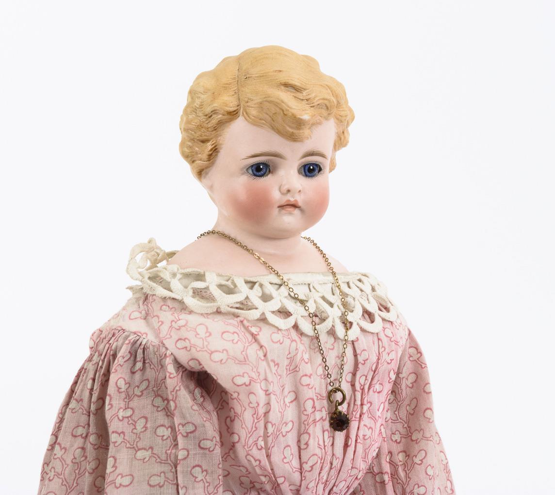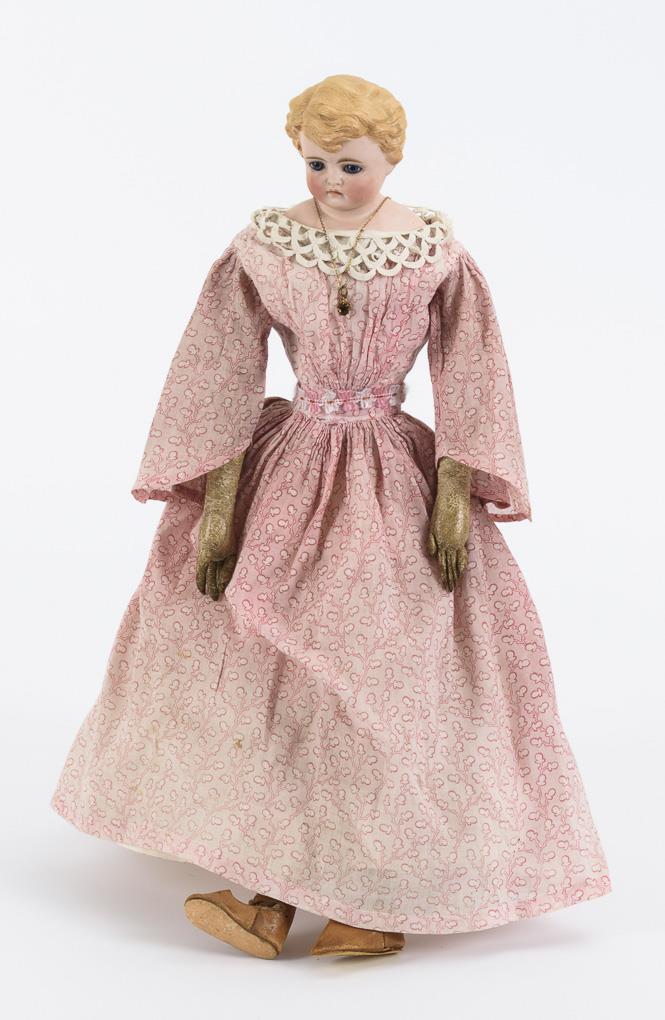 Brustkopf, blaue Glasaugen, blonde Frisur. Schlanker Lederkörper mit Schlenkergliedern und einzeln genähten Fingern. Langes rosa Kleid, braune Lederschuhe. Winziger Chip im rechten Augenwinkel. Körper mit Altersspuren, Schuhe festgenäht.