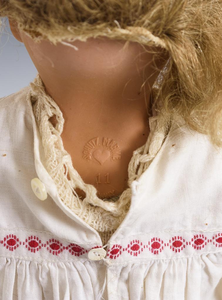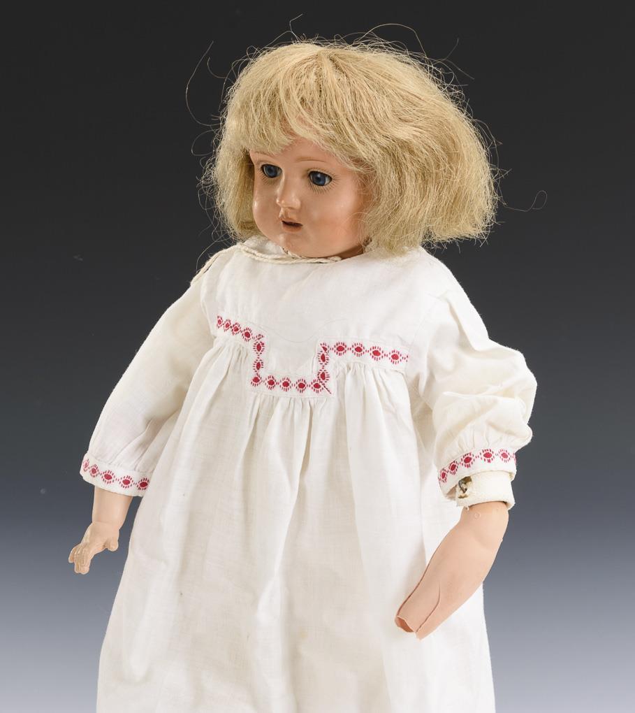 Brustkopf, blaue Schlafaugen, blonde Echthaarperücke. Lederkörper mit Celluloidarmen, Kniezwickeln und Unterschenkeln aus Stoff. Weißes Kleid, weißer Mantel, Haube. Körper mit Altersspuren, 1 Arm defekt.