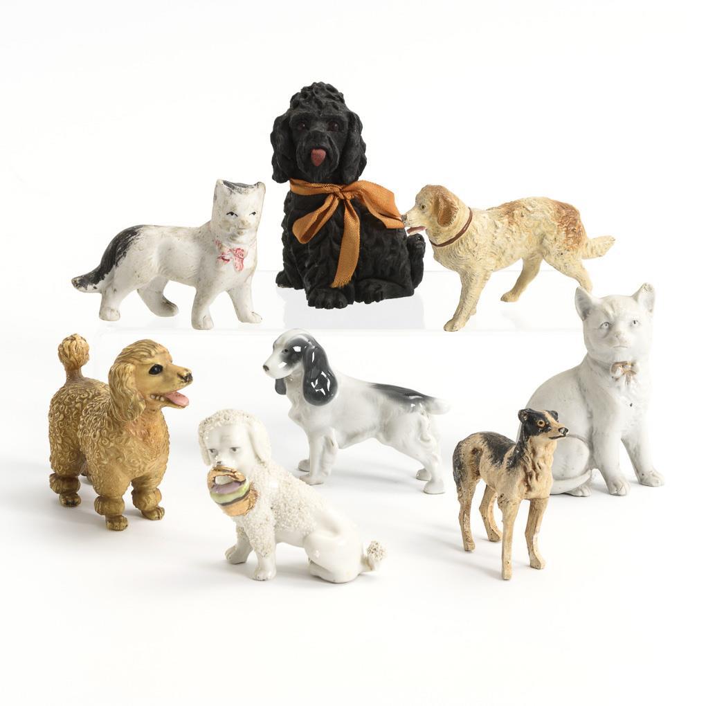 Verschiedene Nippesfiguren aus Porzellan, Masse, Holz und Celluloid, darunter 1 kleiner "Puffhund". Altersspuren, 1 Bein geklebt.
