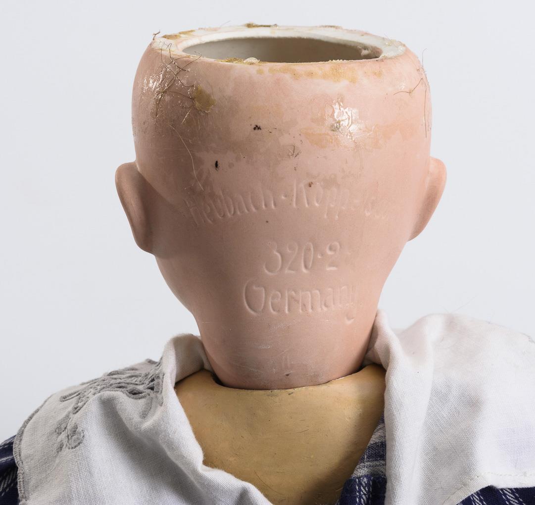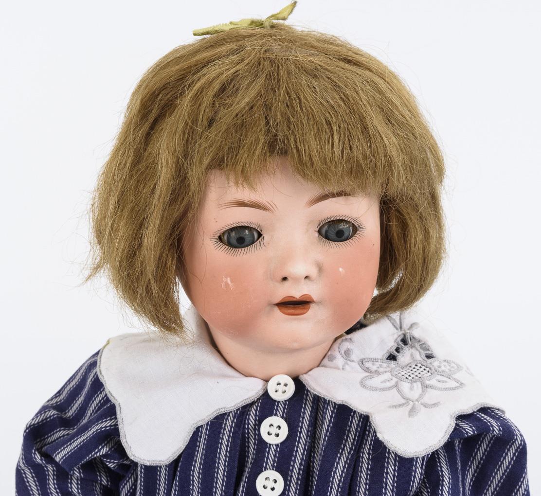 Kurbelkopf, blaue Schlafaugen, Wimpern, offene Nasenlöcher, blonde Echthaarperücke. 5-teiliger Sitzbabykörper. Blau-weiß gestreifter Anzug mit weißem Kragen. Kopf durchleuchtet: ohne Defekte. Lider und linke Wange berieben. Körper partiell übermalt.