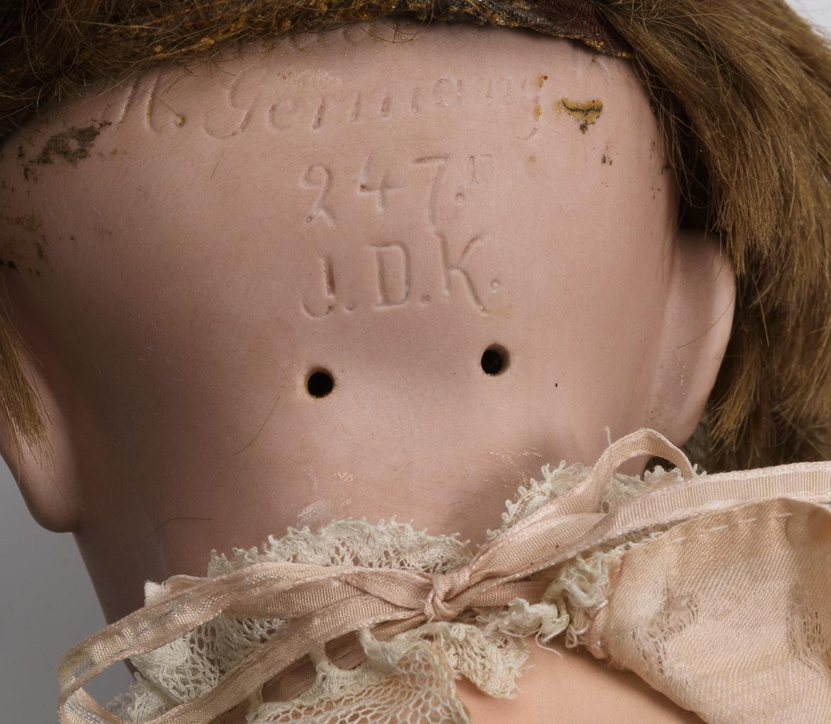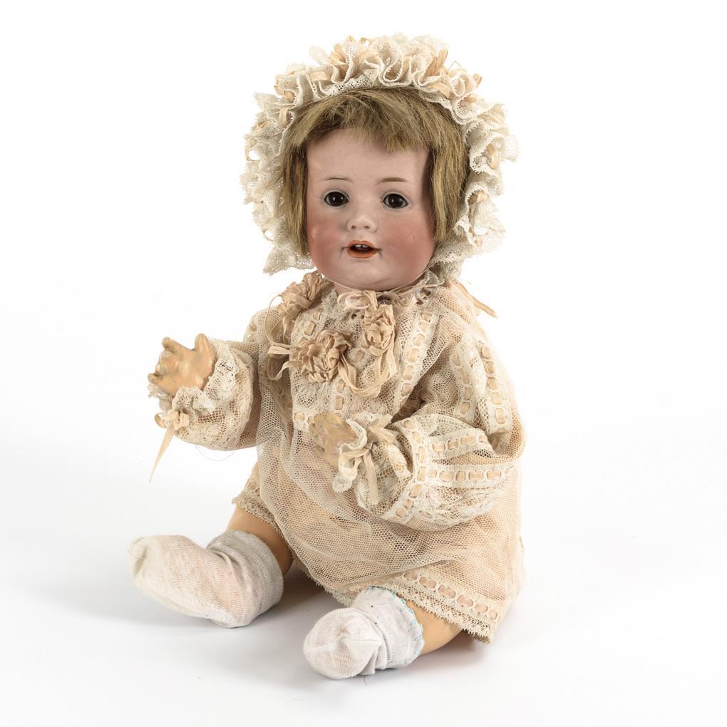 Kurbelkopf, braune Schlafaugen, festgeklebte blonde Echthaarperücke. 5-teiliger Sitzbabykörper. Rosa Kleidchen mit Spitze, passende Haube. Kopf nicht durchleuchtet, jedoch keine Defekte sichtbar. Lider minimal berieben. Körper mit kleinen Farbdefekten, 1 Finger links fehlt.