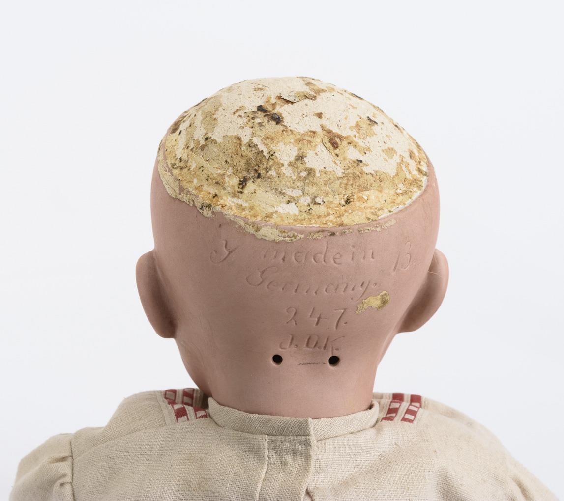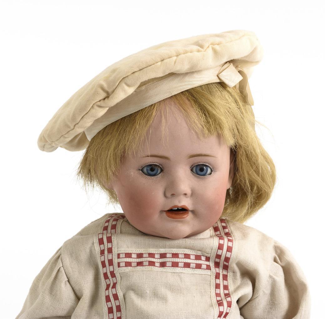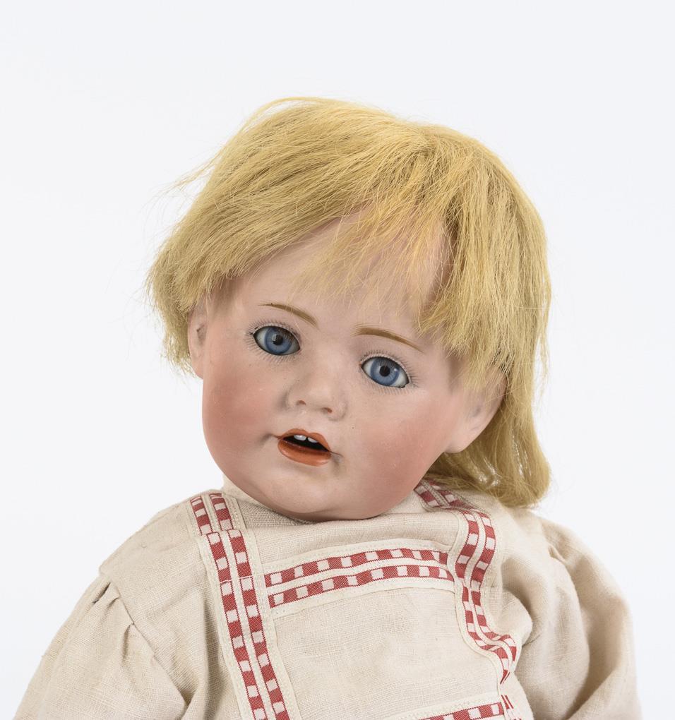 Kurbelkopf mit vergipstem Kopfdeckel, verklemmte blaue Schlafaugen, Wimpern, blonde Echthaarperücke. 5-teiliger Sitzbabykörper. Beigefarbener Leinenanzug mit rotkarierten Borten. Kleiner Ausbruch am linken Auge. Körper partiell übermalt.