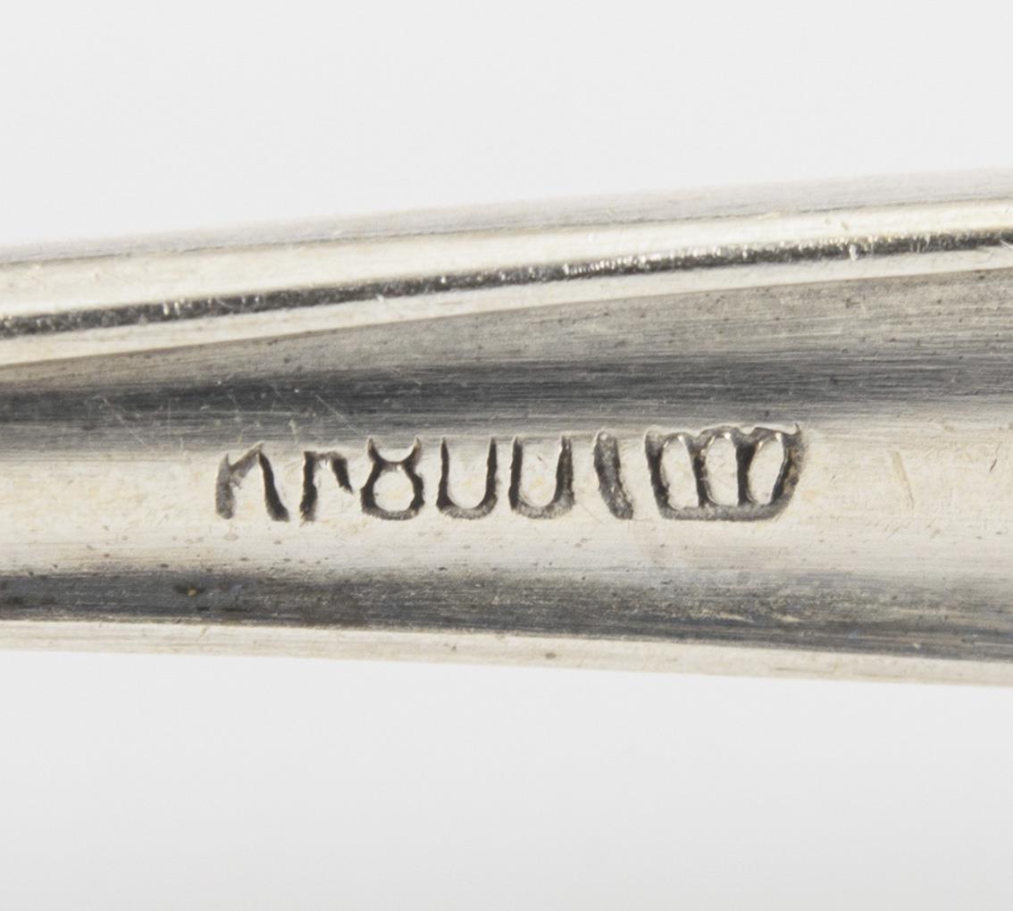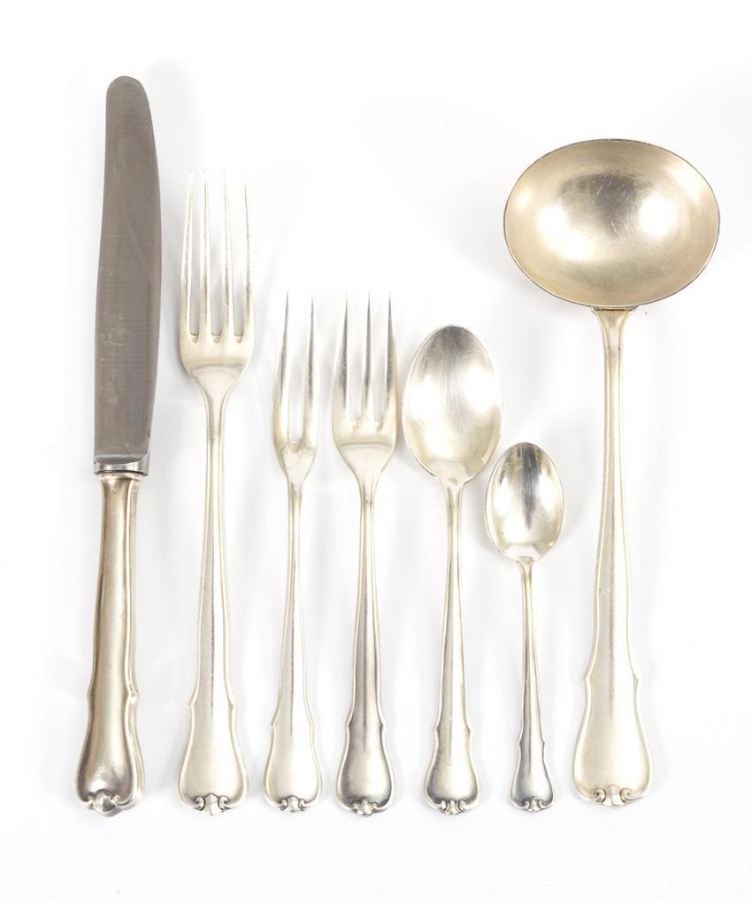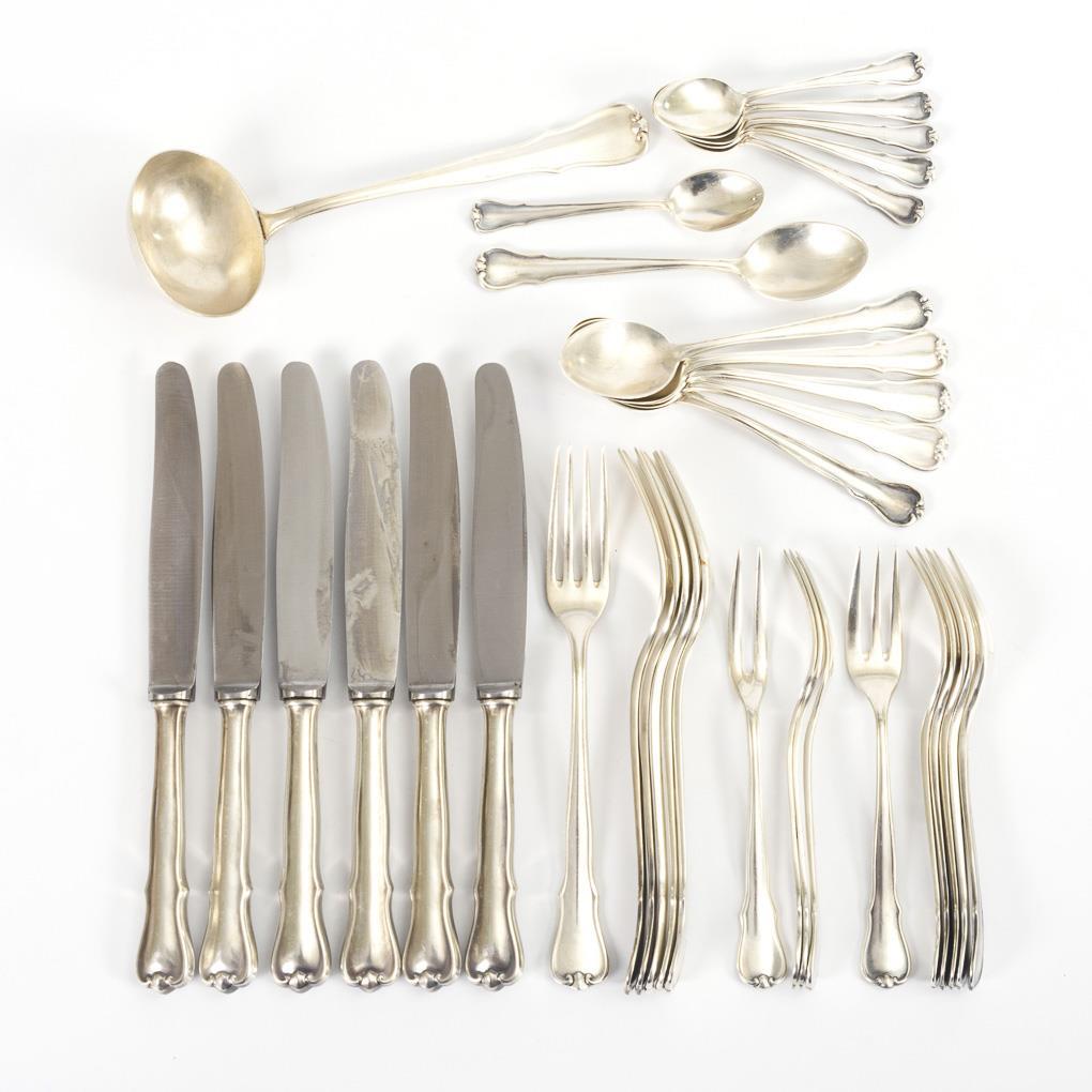 35 Teile: Je 6 Messer, Gabeln, Teelöffel und Mokkalöffel, 8 Kuchengabeln, 2 kleine Vorlegegabeln und 1 Saucenkelle.