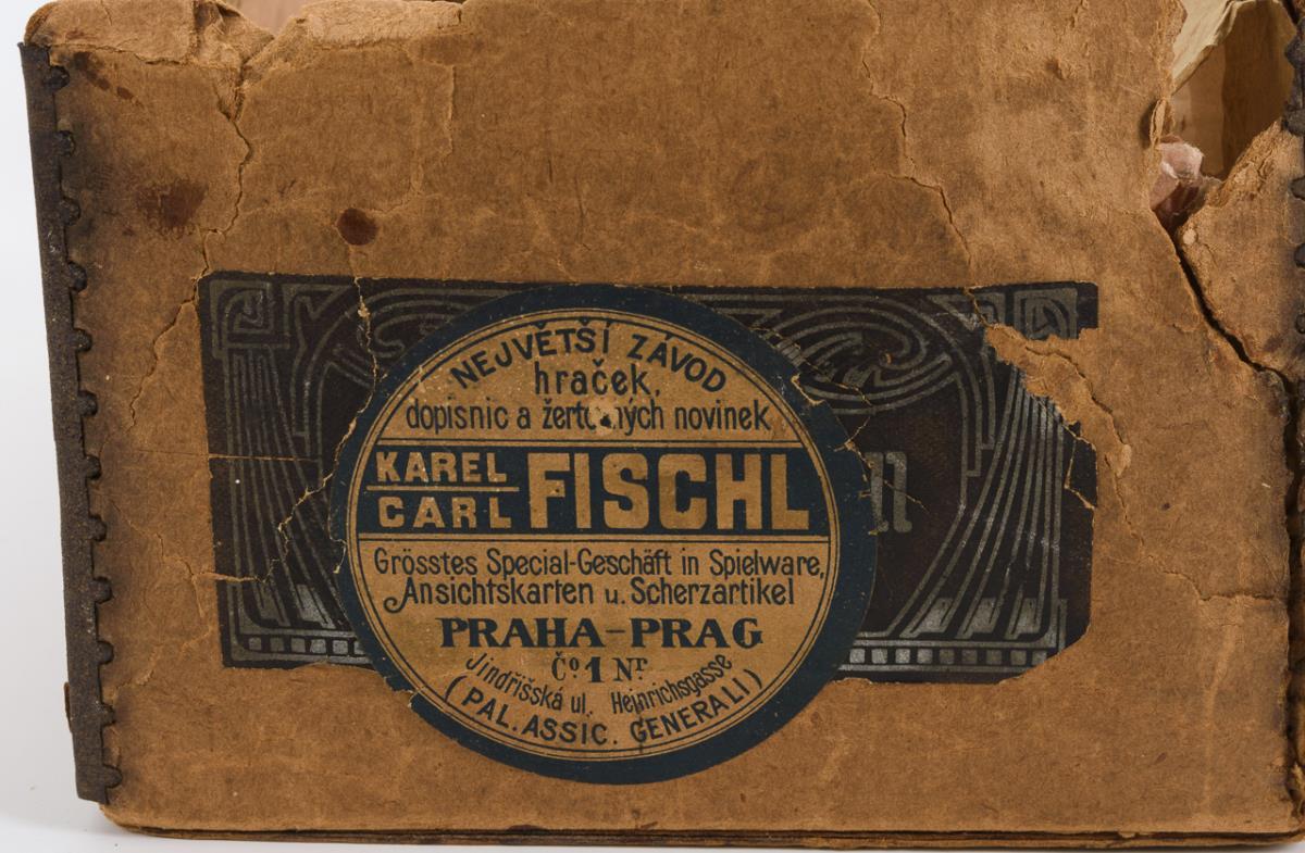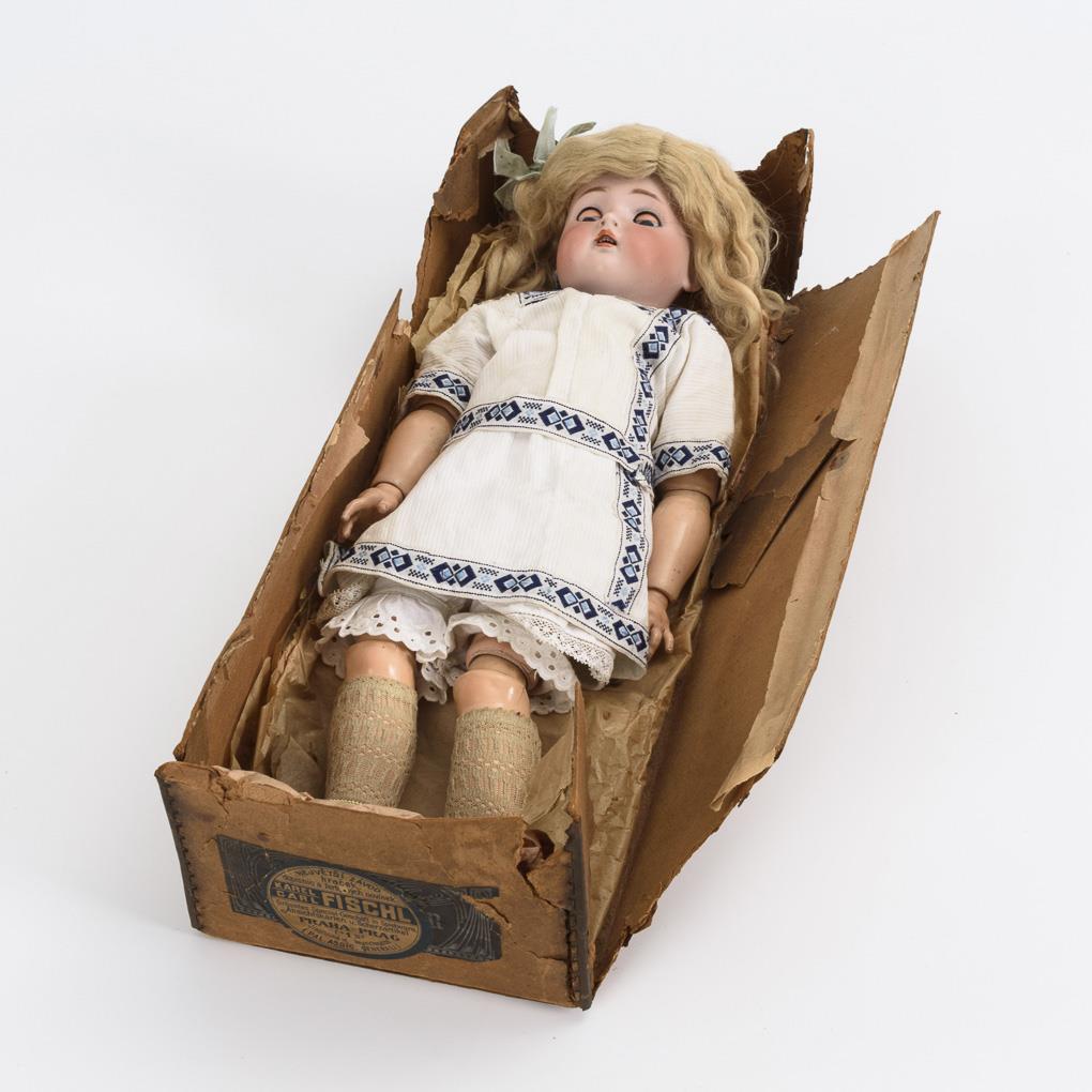 Kurbelkopf, blaue Schlafaugen, Ohrlöcher, blonde Mohairperücke. 15-teiliger Gliederkörper. Weißes Kleid mit blau-gemusterten Borten. Defekter Originalkarton mit Aufkleber des Spielwarenhändlers Carl Fischl, Prag. Kopf durchleuchtet: ohne Defekte.