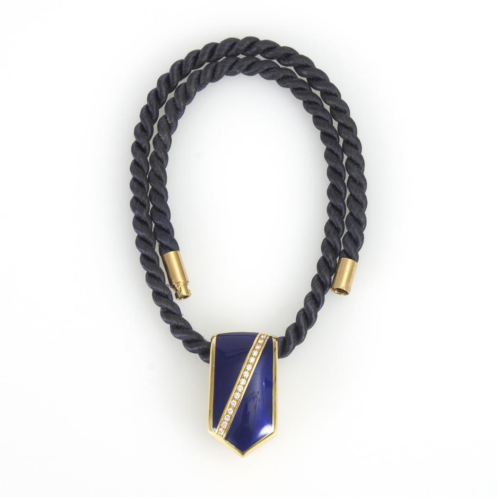 Massiver Anhänger mit eingelassenen Brillanten zwischen Transluzidemail. Klippöse mit Sicherung. Textile Kordelkette mit Patentverschluss.