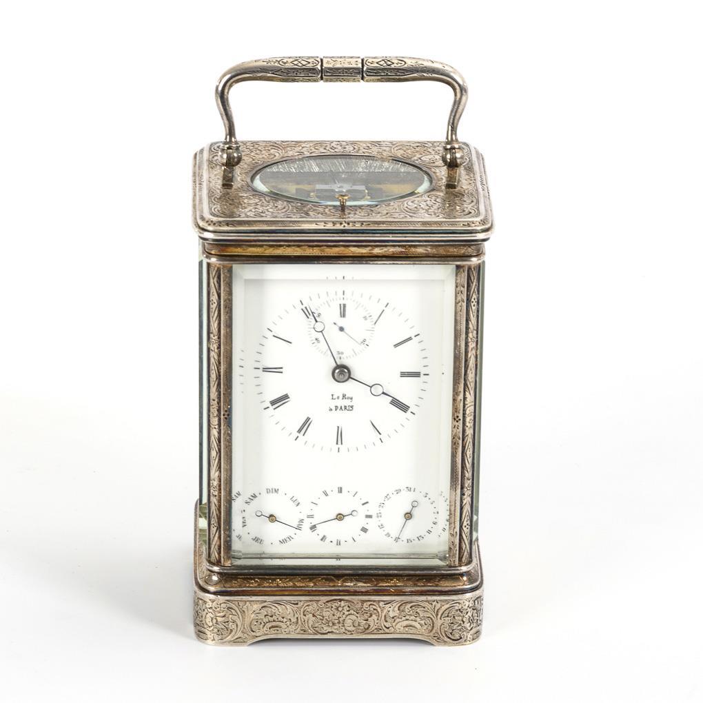 Ungemarktes Messingwerk, sichtbare Unruh mit Ankerhemmung, Stunden- und Viertelstundenschlag auf 2 Glocken, separater Drücker für Repetition. Unterseitig Stellhebel für "Silence", "Petite Sonnerie" und "Grande Sonnerie". Gehwerk und Sonnerie funktionstüchtig, Einstellung des Alarms überholungsbedürftig. Weißes Emailzifferblatt mit römischen Zahlen, Minutenkranz und Breguet-Zeigern, kleine Sekunde bei der 12, im unteren Bereich 3 Hilfszifferblätter für Wochentag (französisch bezeichnet) und Datum (arabische Zahlen) sowie Wecker (römisch beziffert), handschriftlich bezeichnet "Le Roy à PARIS".