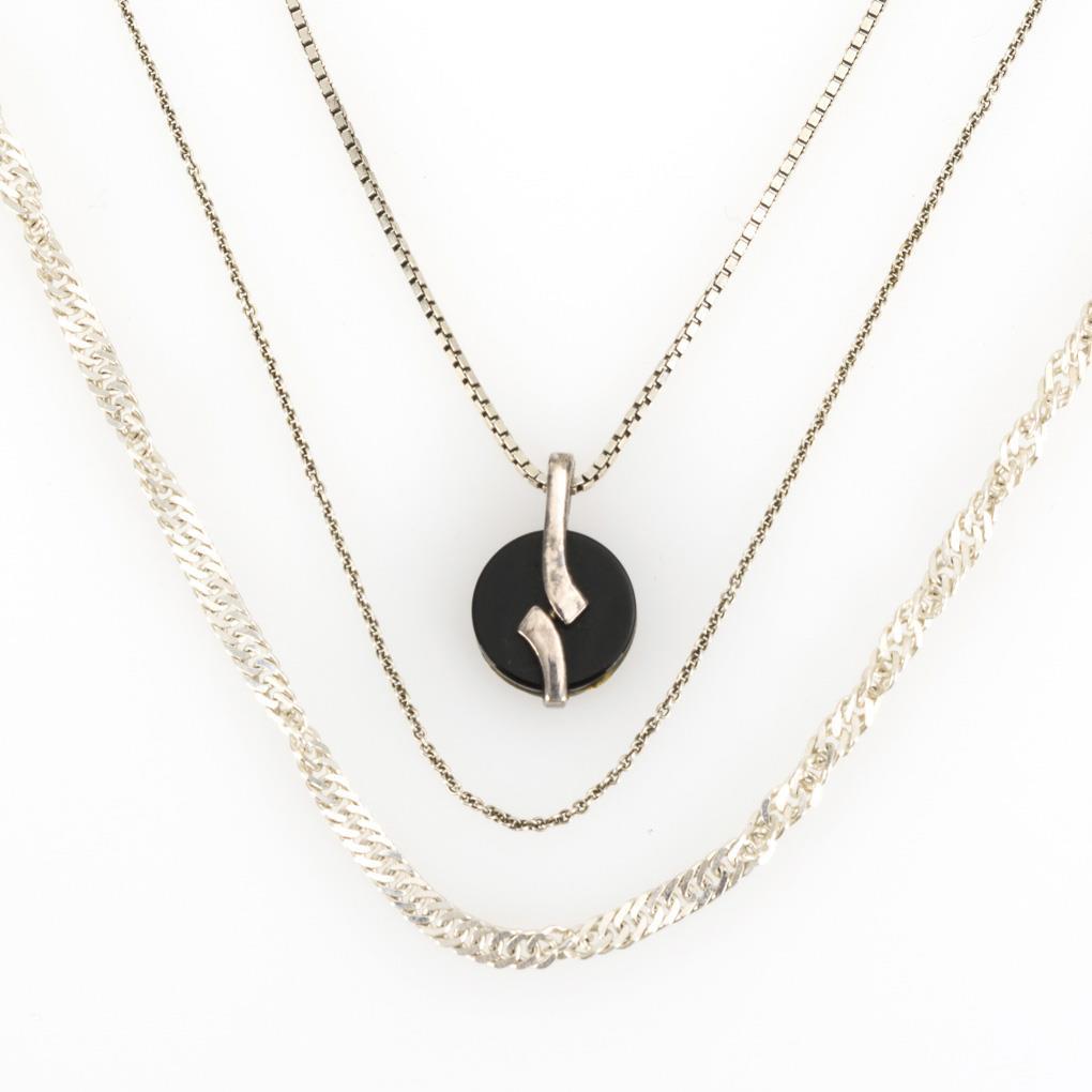 Kleiner Onyxanhänger an Venezianerkette. Gedrehte Panzerkette und zarte Ankerkette mit Ringfederschließen.