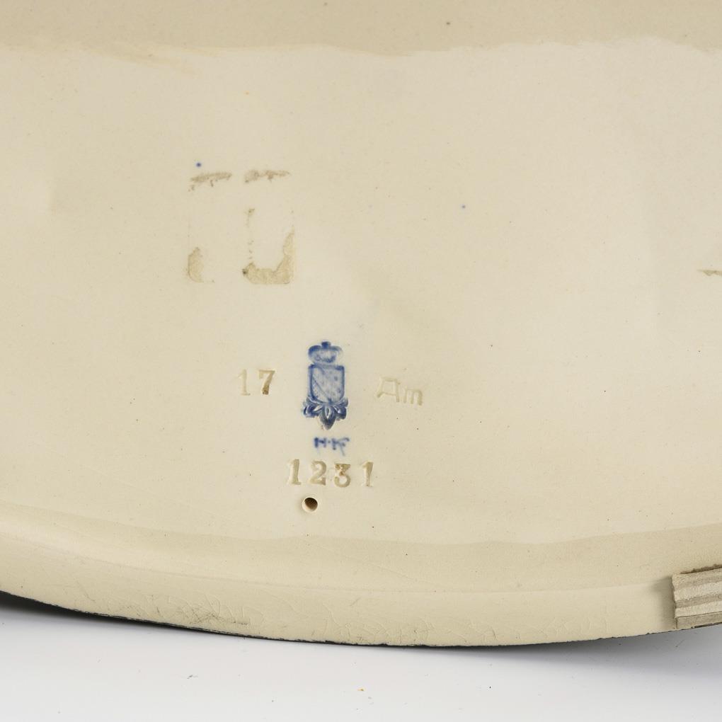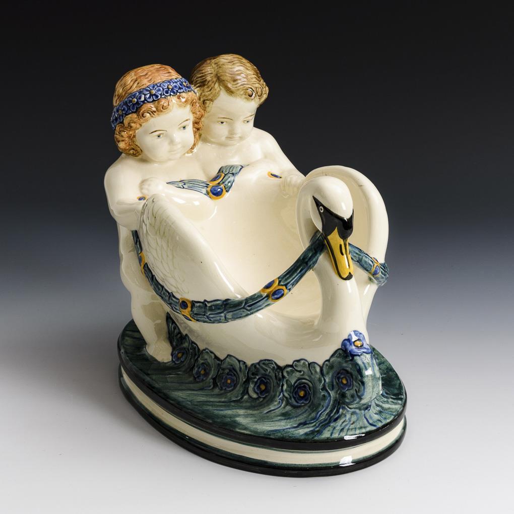 Jugendstil-Schale: Schwan mit 2 Putten. Karlsruher Majolika.