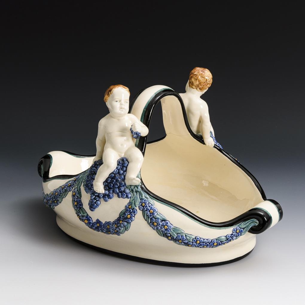 Ovale Henkelschale mit 2 Putten, Blumenreliefs und endvolutierten Schmalseiten. Henkel mit Riss, Wandung mit Glasurriss, partiell minimale Glasurchips.