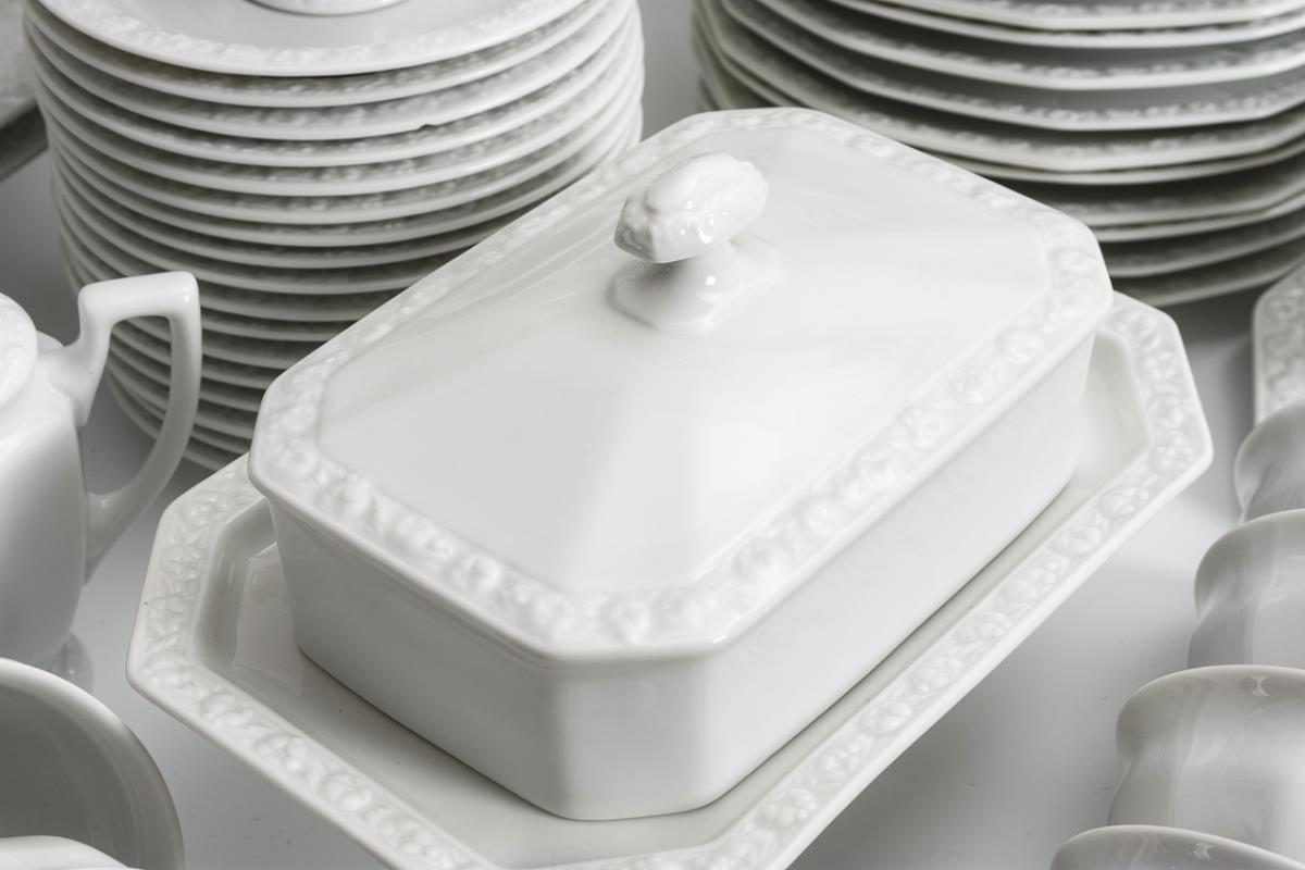 107 Teile. 2 Kaffeekannen (H 24 und 20,5 cm), 2 + 1 Zuckerdosen, 1 + 2 +1 Milchkännchen, 17 Kaffeetassen, 4 + 3 Teetassen, 17 + 8 Untertassen, 2 + 2 Eierbecher, 16 Frühstücksteller, 10 Suppenteller, 10 Speiseteller, 2 Schüsseln (Ø 25 cm), 2 Platten (L 36 und 38,5 cm), 1 Rundplatte (Ø 28,5 cm), 1 Butterdose, 1 + 1 Saucieren und 1 kleiner Teller (Ø 11 cm). Chip an 1 Untertellerr- und 1 Speisetellerrand, 1 Tassenrand bestoßen.