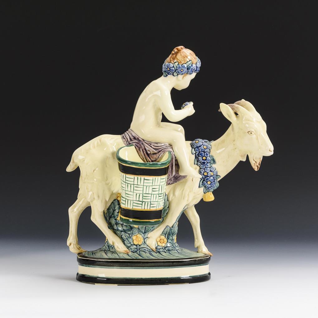Auf einem Ziegenbock mit Tragekörben sitzendes Mädchen, schmückende Blumenreliefs. Restauriert.