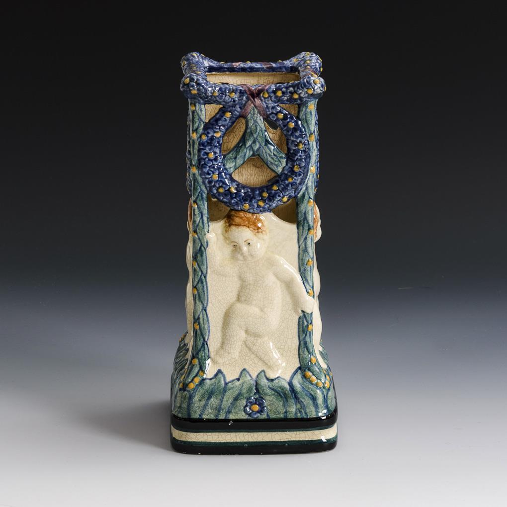 Jugendstil-Vase mit 4 Putten. Karlsruher Majolika.
