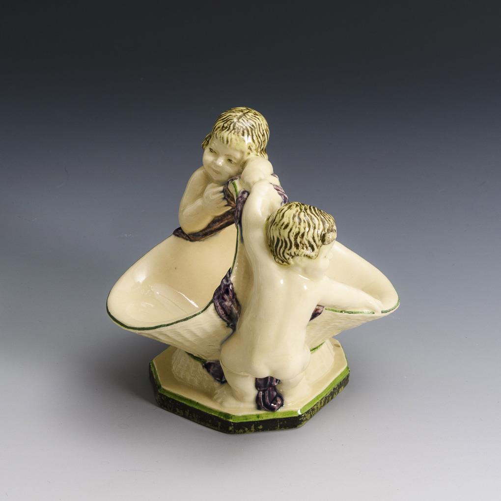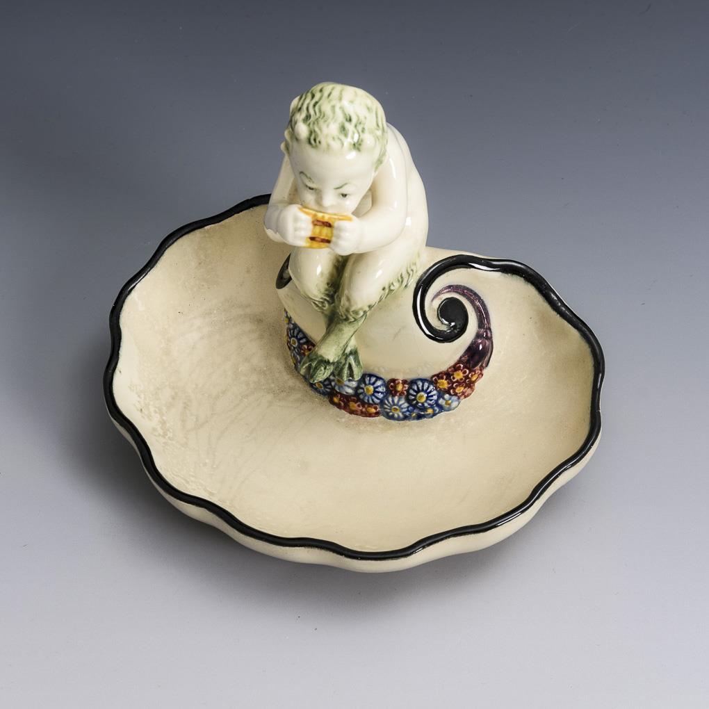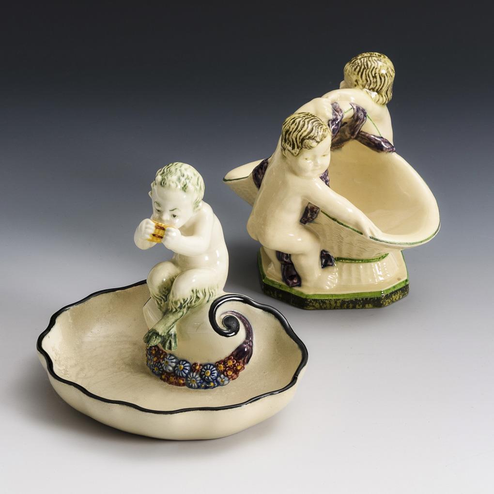 Schale mit Faun: Karlsruher Majolika, Blaue Pressmarke mit Zusatz "Made in Germany", ab 1908, Modell-Nr. 1239, Entwurf: Max HEINZE, Ausführung: 1911 bis 1923, restauriert, H 13 cm. Korbschale mit 2 Putten: Keramische Werkkunst, Grüne Stempelmarke, 1914 bis 1921, H 13 cm.