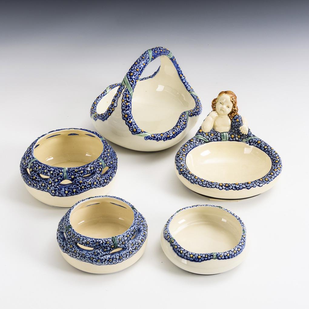5 kleine Jugendstil-Schalen mit Blumenreliefrändern. Karlsruher Majolika.