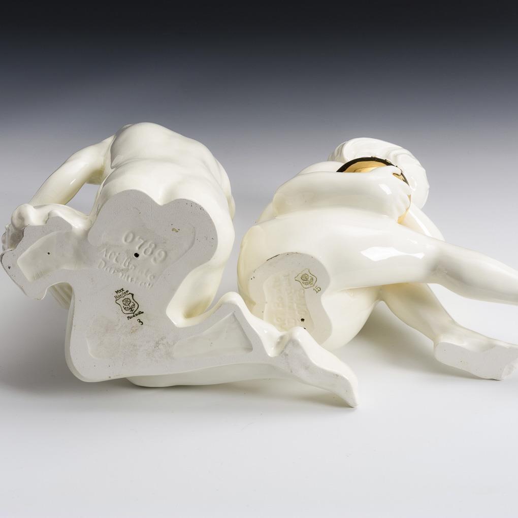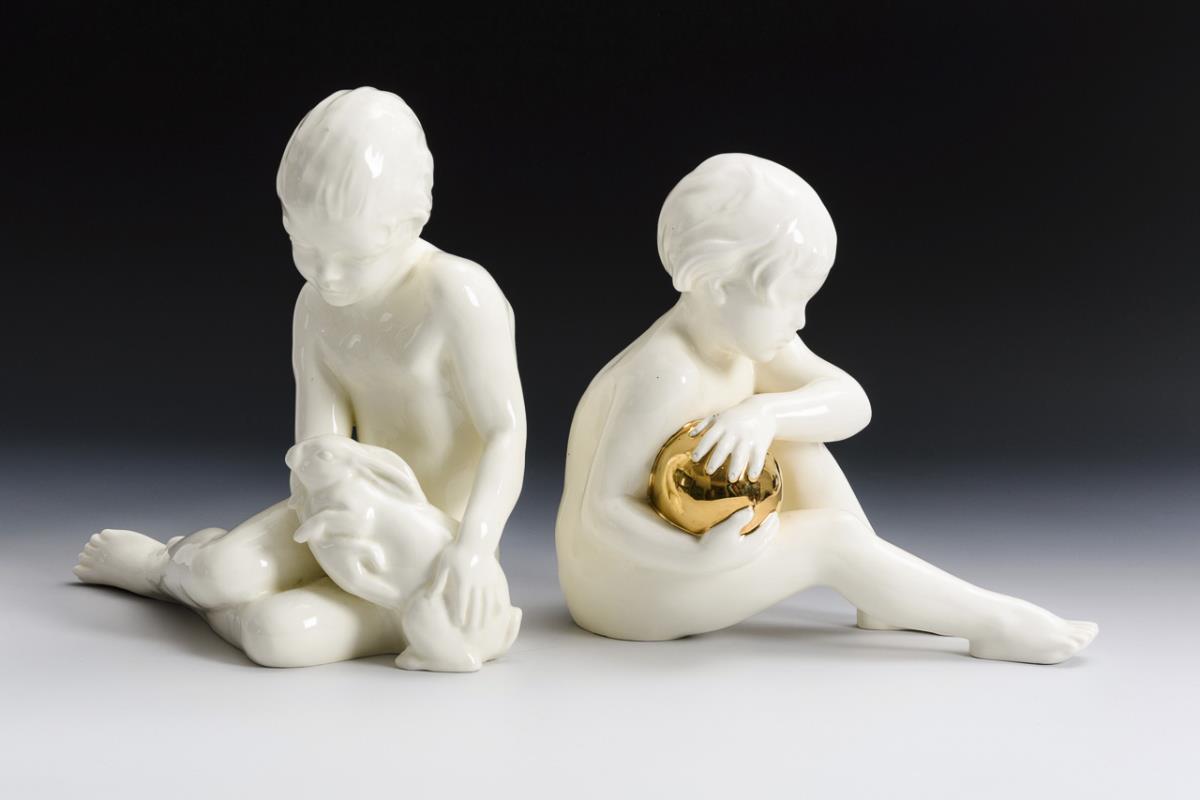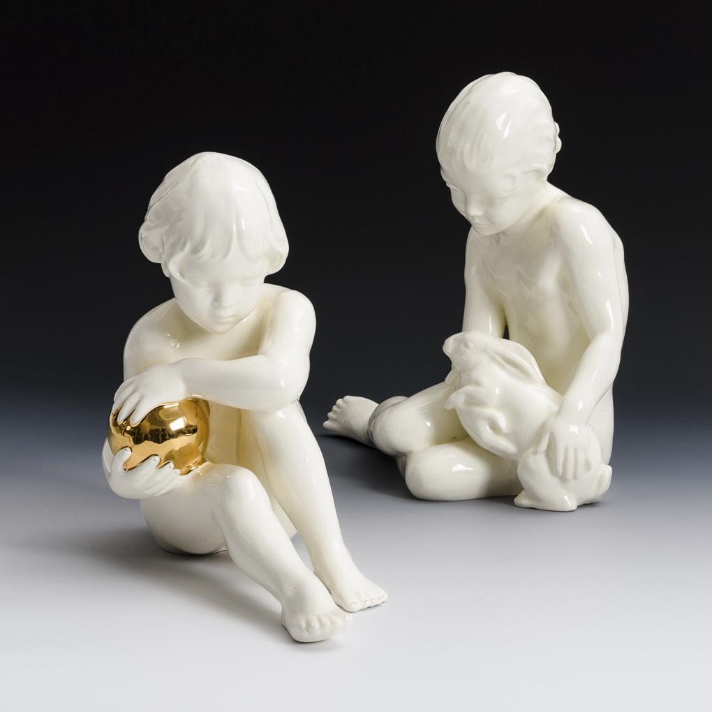 2 Kinderplastiken: Kind mit Ball und Kniendes Kind mit Hase. Max Roesler.