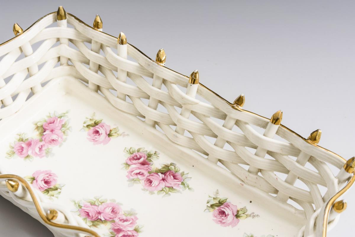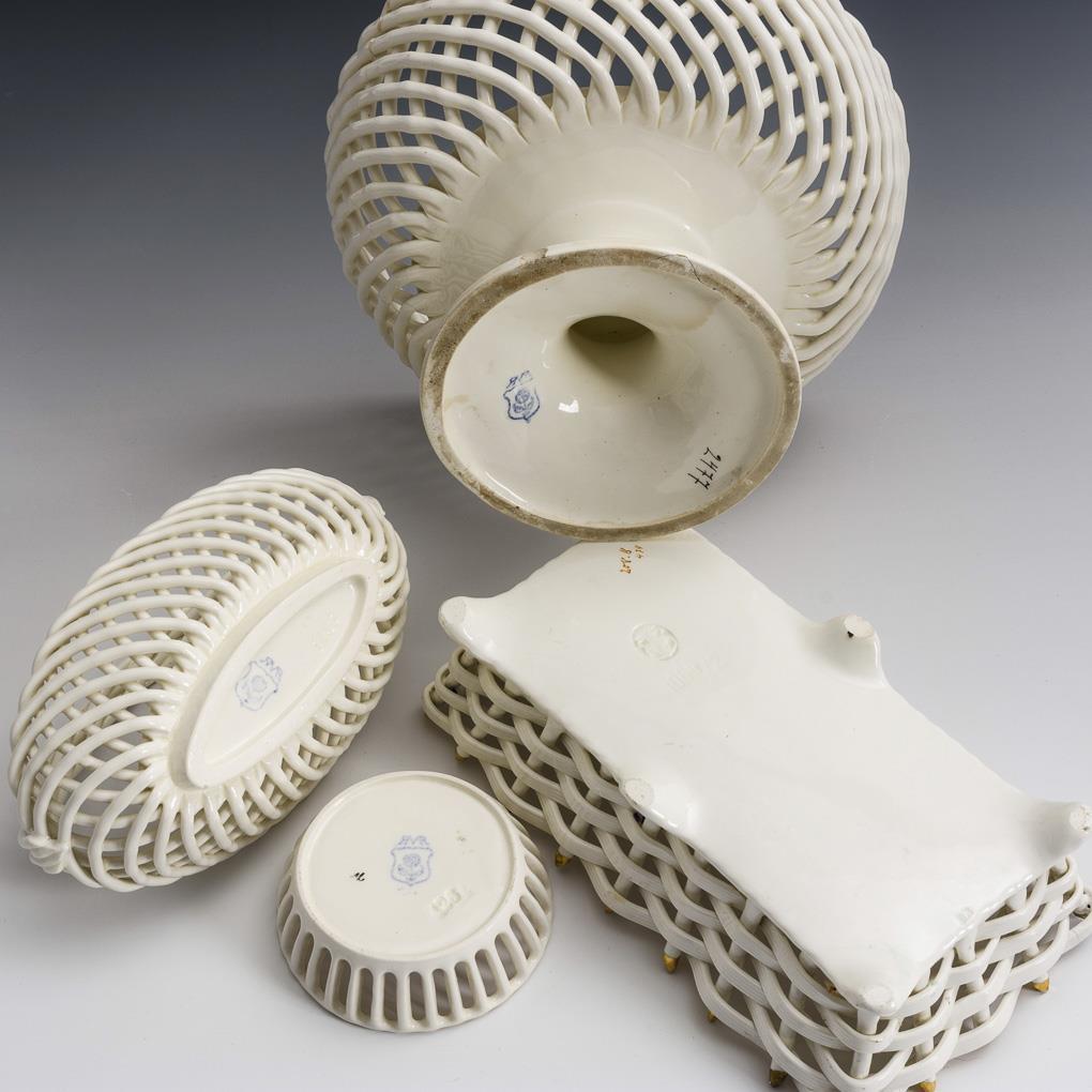 Runder Tafelaufsatz (H 13,5 cm), Rechteckschälchen mit Korbrand (L 22,5 cm), ovales Henkelkörbchen (L 18 cm), rundes Schälchen (Ø 9 cm). Leicht berieben, Korbrand an einigen Stellen geklebt, Wandung des Tafelaufsatzes rissig.