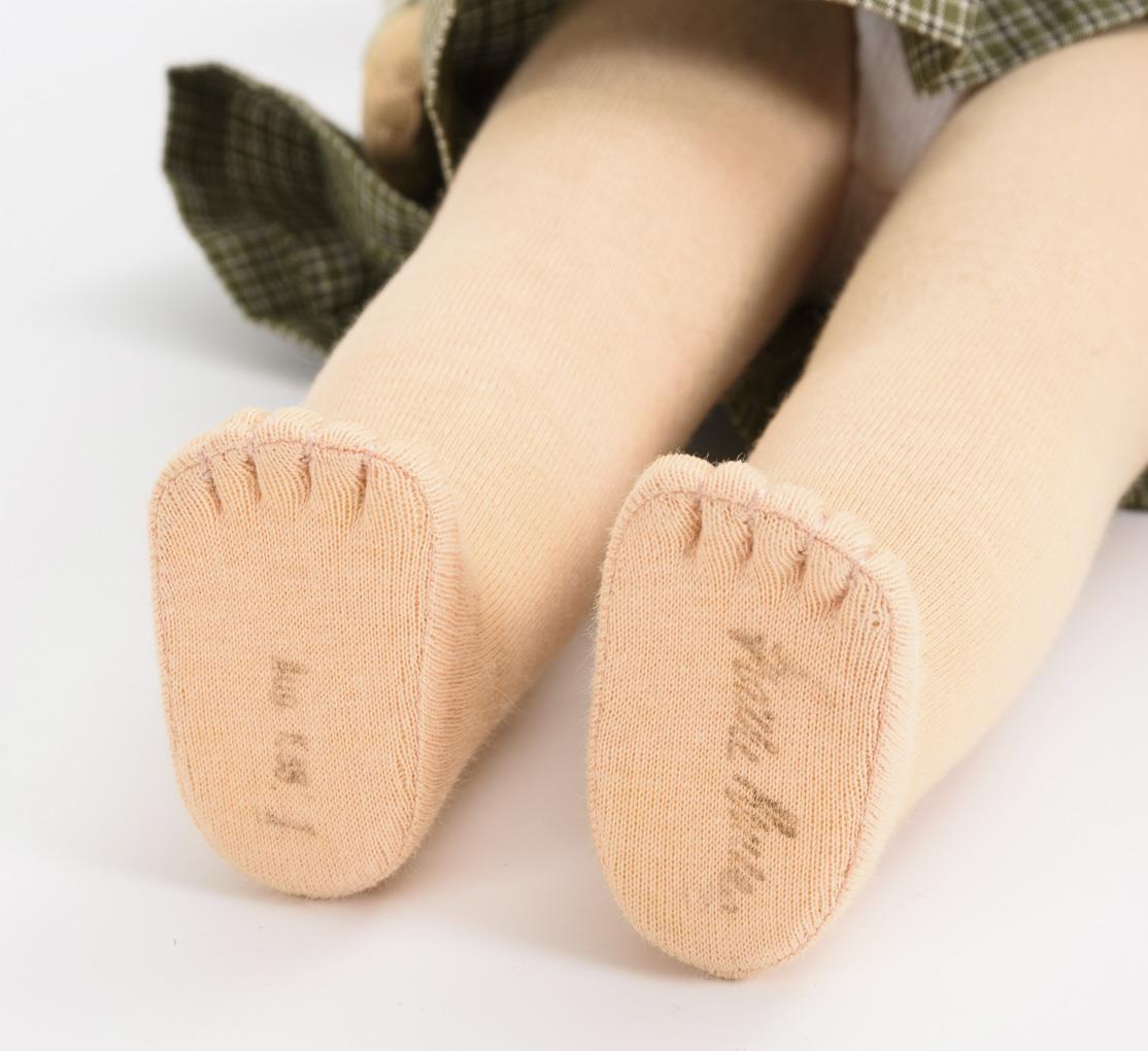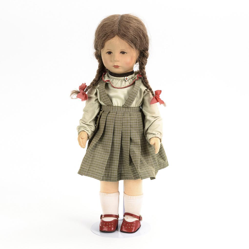 Kurbelkopf, gemalte braune Augen, braune Echthaarperücke mit Zöpfen. Stoffkörper mit locker angenähten Armen, Beine mit Scheibengelenken. Originalbekleidet mit kariertem Trägerrock und roten Schuhen. Unbespielt, mit leichten Altersspuren.