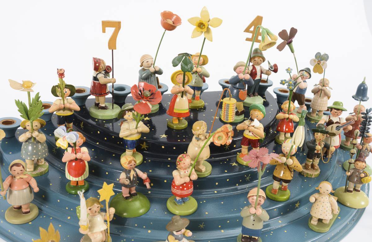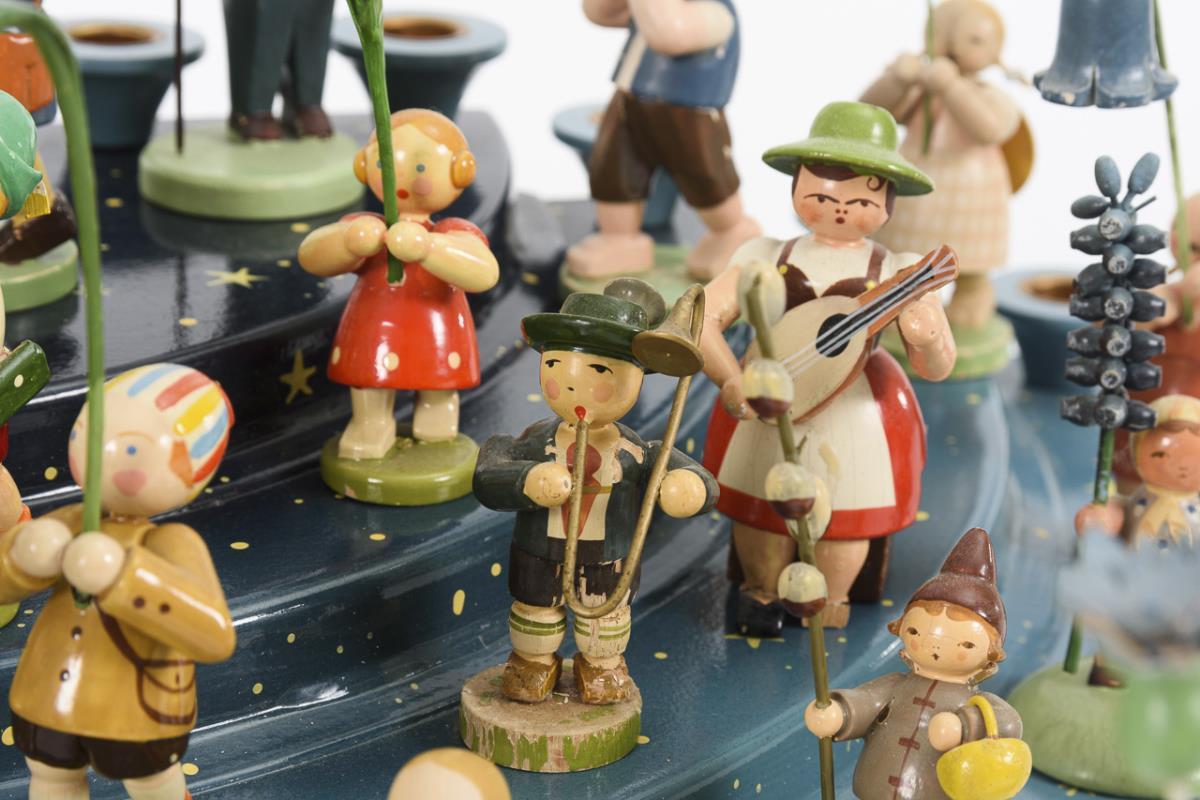 Vorwiegend Blumenkinder, darunter auch einige andere Figürchen. Dazu halbkreisförmige Engelstreppe mit 12 Kerzentüllen (10 x 57,5 x 29 cm). Teils kleine Defekte.