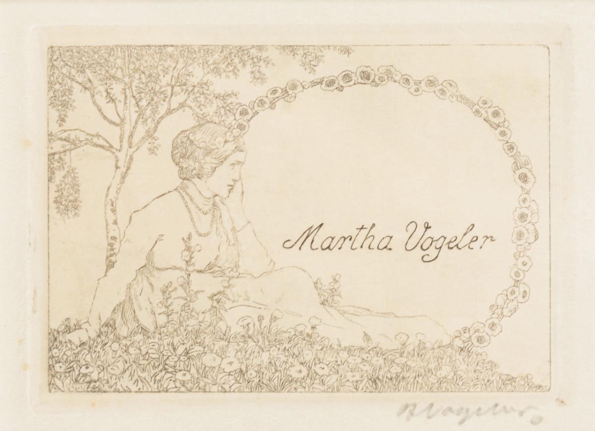 "Martha Vogeler", Radierung, Bleistiftsignatur, Platte: 6,5 x 9 cm, gerahmt & hinter Glas: 21 x 23,4 cm | "Ex Libris Martha Vogeler", Radierung, undeutlich bezeichnet, Platte: 14 x 9 cm, gerahmt & hinter Glas: 30,5 x 25 cm.