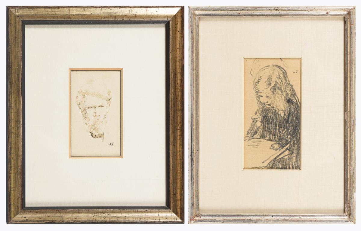 Porträt eines Herren, Tuschzeichnung, monogrammiert, Abbildung: 8,2 x 5 cm, gerahmt & hinter Glas: 21 x 17cm, oben rechts mit kleinem Riss | Porträt eines lesenden Mädchens, Kohlezeichnung, monogrammiert, Abbildung: 12,8 x 6,7 cm, gerahmt & hinter Glas: 15,3 x 19,2 cm.