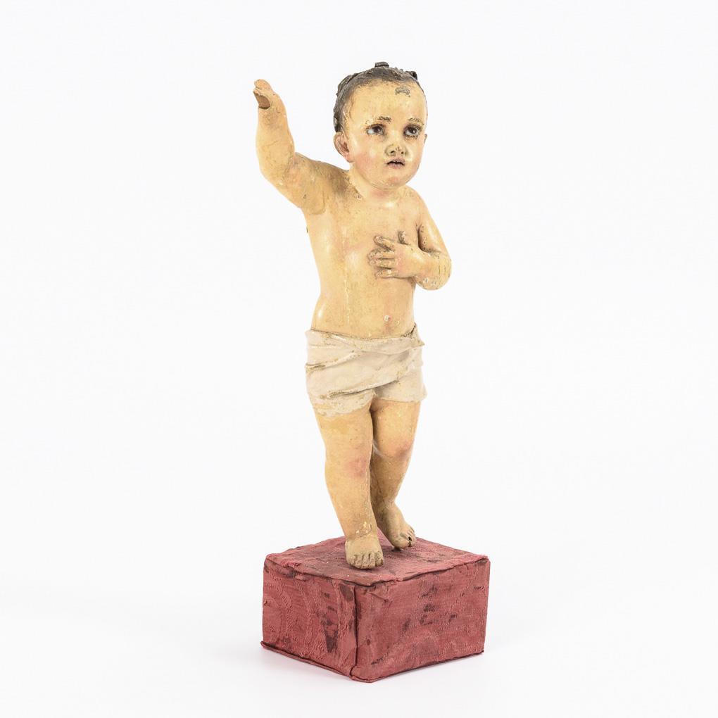 Stehendes Bambino Gesù mit Hüfttuch, das aufblickend eine Hand in die Höhe streckt und eine auf das Herz hält. 1 Hand fehlt, Fassung teils übergangen, Alters-/Gebrauchsspuren. Ergänzter Sockel.