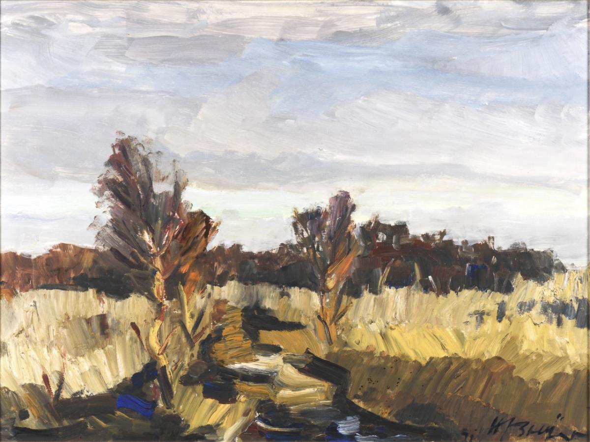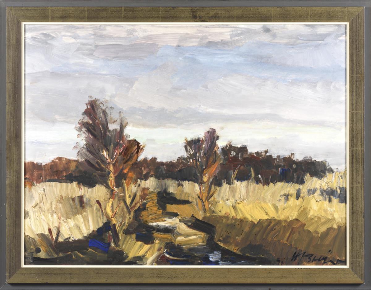 Expressiv gemalte herbstliche Landschaft unter grauem Wolkenhimmel.