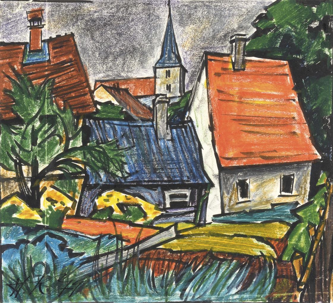 Farbkräftig dargestellte, dicht stehende Dorfhäuser mit Blick zur Kirche unter grauem Himmel. Ein Knick.