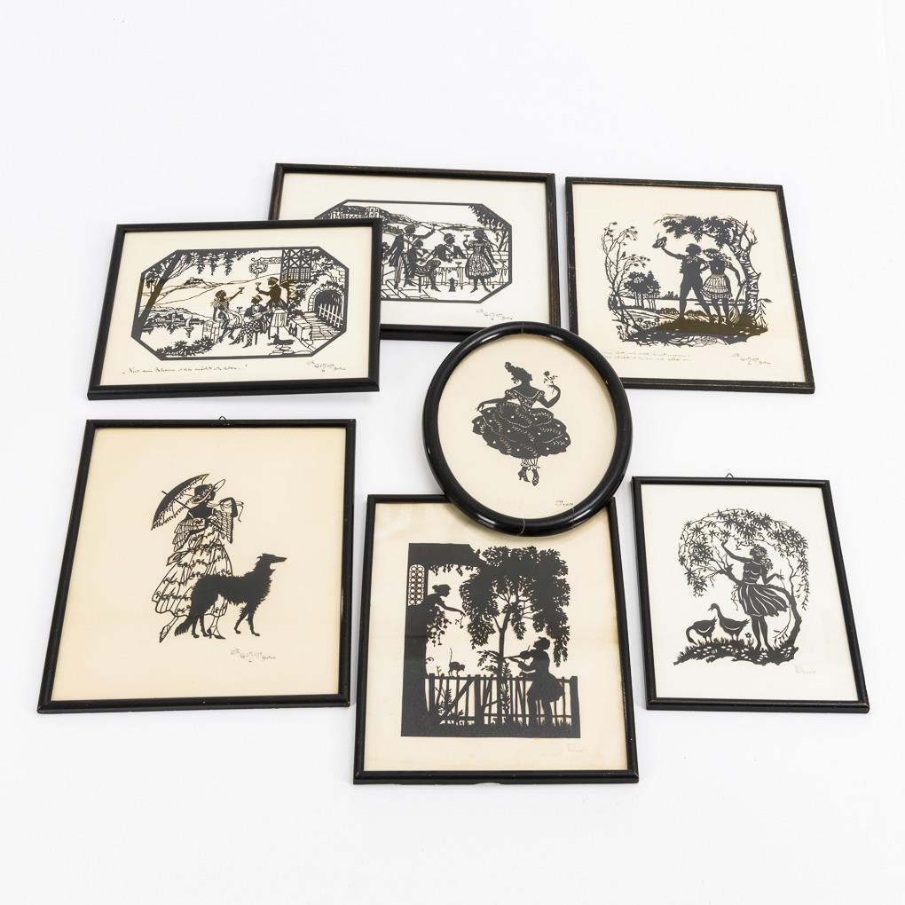 7 gerahmte Scherenschnitte.