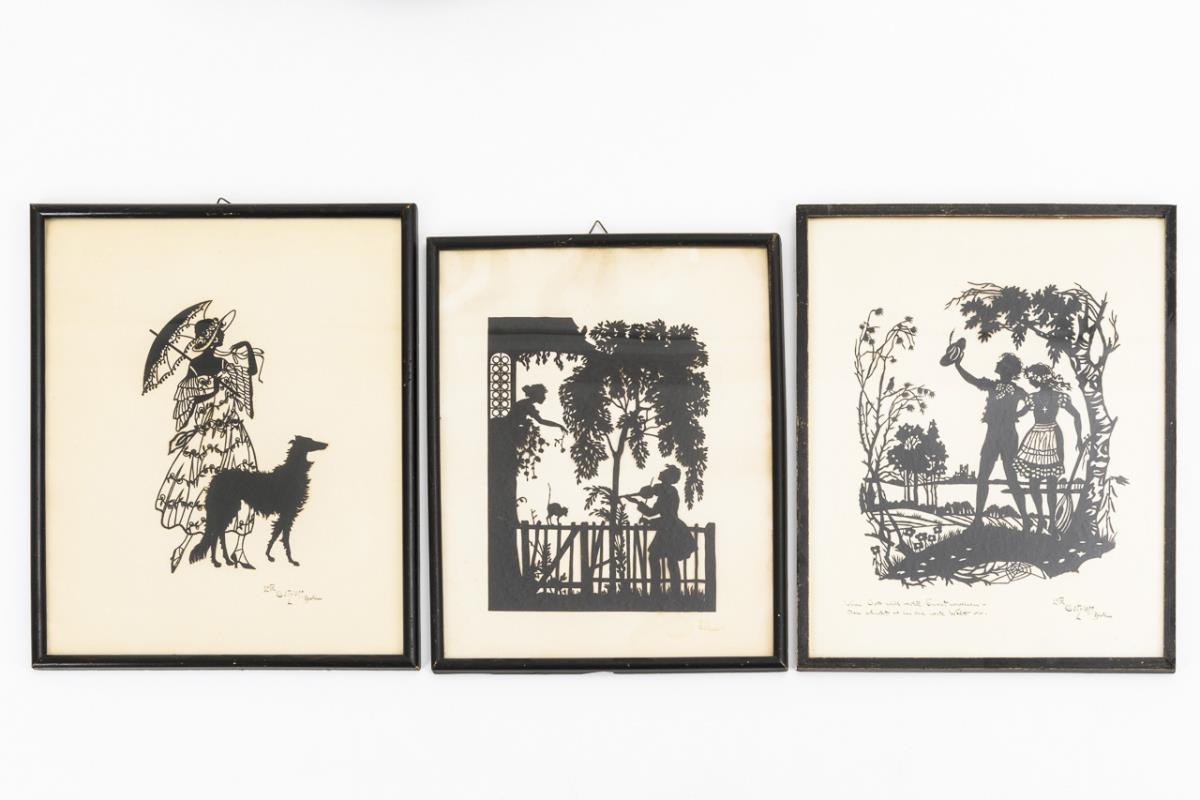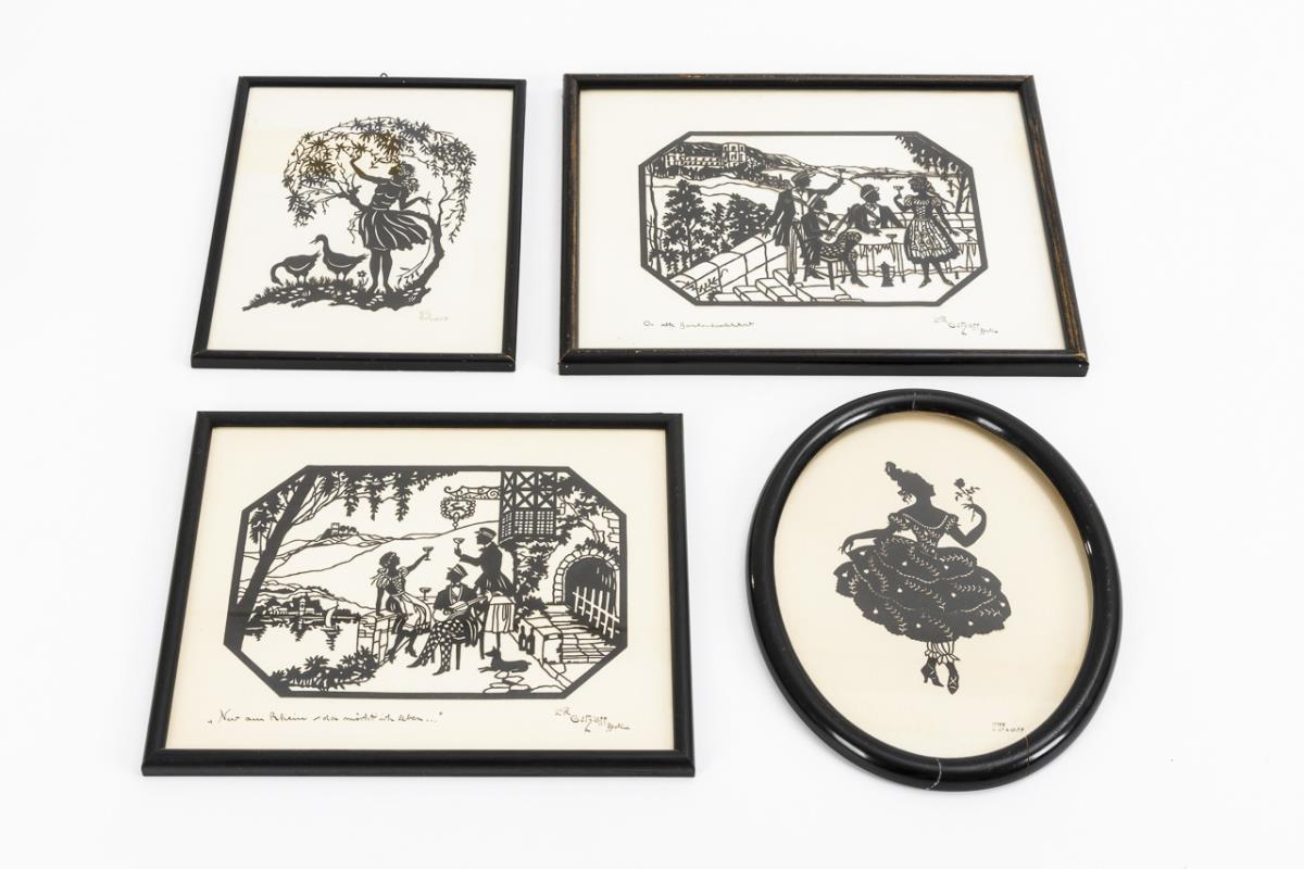 Scherenschnitte, verglaste schwarze Lackrahmen. Scherenschnitt maximal 20 x 15, cm, Rahmen maximal 30 x 24 cm.