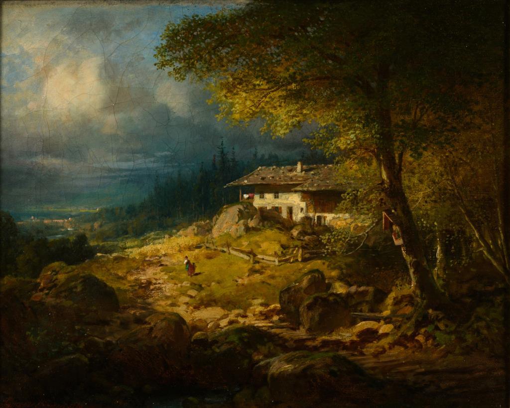 Gebirgslandschaft mit Staffage in idyllischem Lichteinfall. Altersspuren.