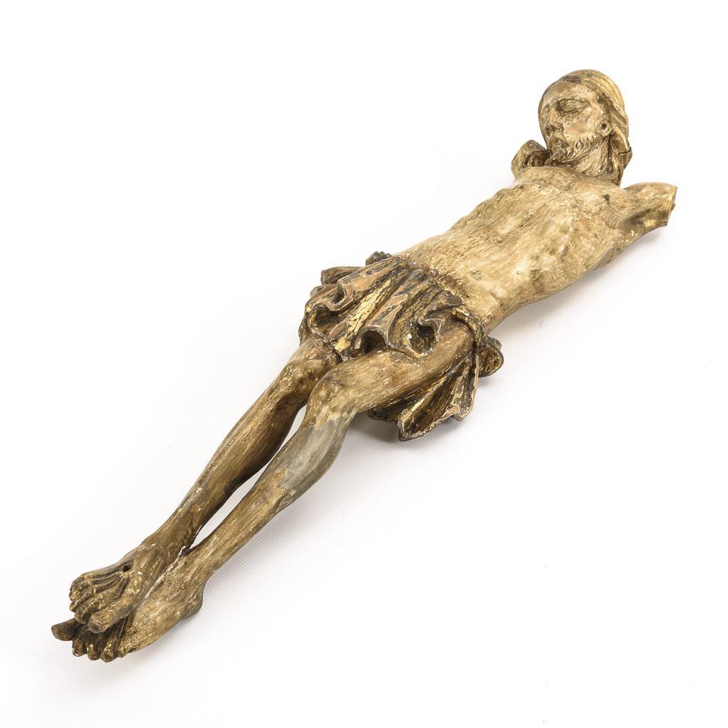 Christus mortuus im Dreinageltypus mit gelängtem Köper in pittoresker Drehung. Arme fehlen, 1 kleiner Trockenriss, Schäden an der Fassung, nachträgliche Goldbronzierung zumeist wieder entfernt.