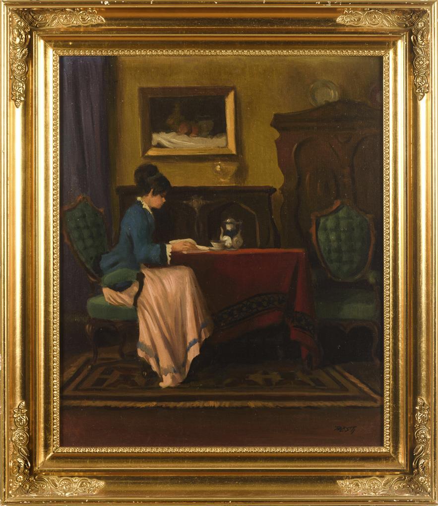 Junge Frau mit einem Buch am Tisch und einer Tasse Tee im gutbürgerlichen Zimmer.
