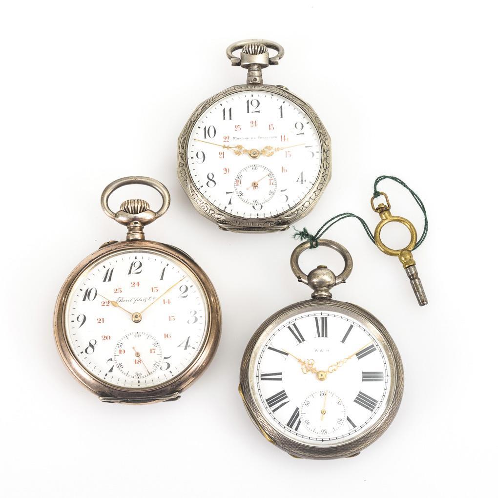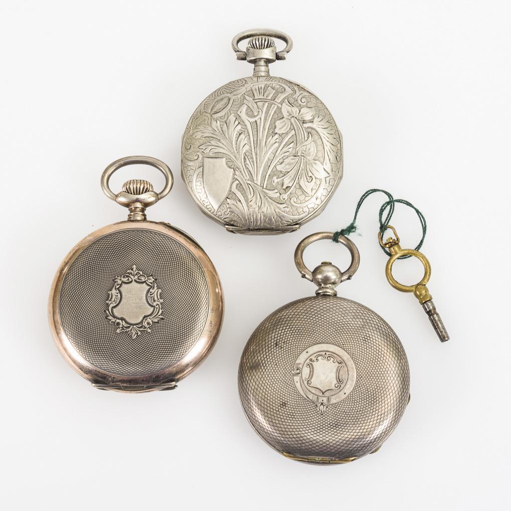 1x Halbmond/Krone/800 Silber gepunzt: Borel Fils & Cie., guillochiertes Galonné-Gehäuse mit leerer Wappenreserve, weißes Emailzifferblatt mit roten und schwarzen arabischen Zahlen, kleiner Sekunde und Spade-Zeigern, BFC gemarktes Werk mit Ankerhemmung, Werknummer 358300, läuft, Ø 5,1 cm, 87 g. 2x versilbert (geprüft): W & H, guillochiertes Gehäuse mit leerer Wappenreserve, weißes Emailzifferblatt mit römischen Zahlen, kleiner Sekunde und Louis Quinze-Zeigern, gemarktes Brückenwerk mit Zylinderhemmung und Schlüsselaufzug, mit Schlüssel, läuft kurz an, Ø 4,9 cm. Ungemarkt, floral reliefiertes Gehäuse, weißes Emailzifferblatt mit roten und schwarzen arabischen Zahlen, bezeichnet "Montre de Précision", kleiner Sekunde und floralen Zeigern, ungemarktes Werk mit Ankergang, läuft, Ø 4,8 cm. Partiell fein haarrissig, leichte Gebrauchsspuren.