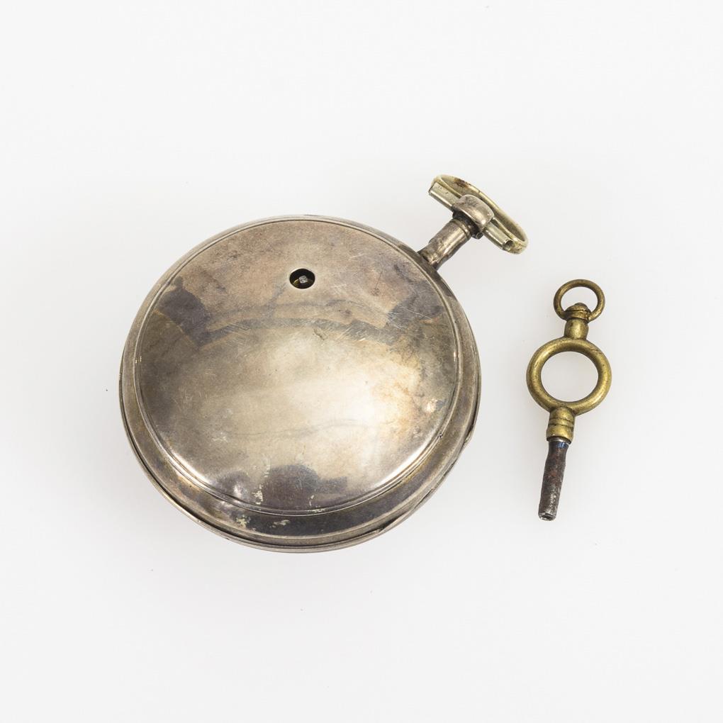 Glattes Gehäuse, hoher Stegbügel mit ergänztem Henkel. Alters- und Gebrauchsspuren, Zeiger ergänzt, Gehäuse etwas gedellt, Lötspuren.