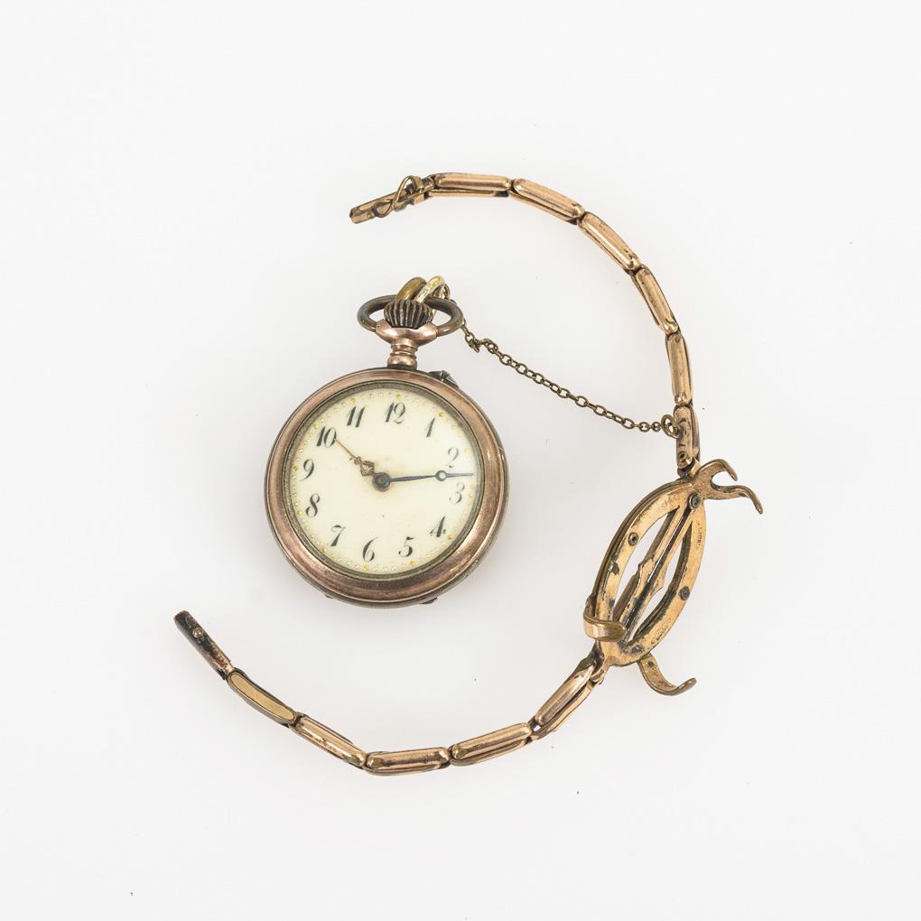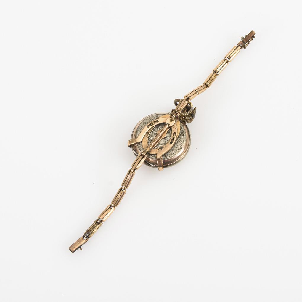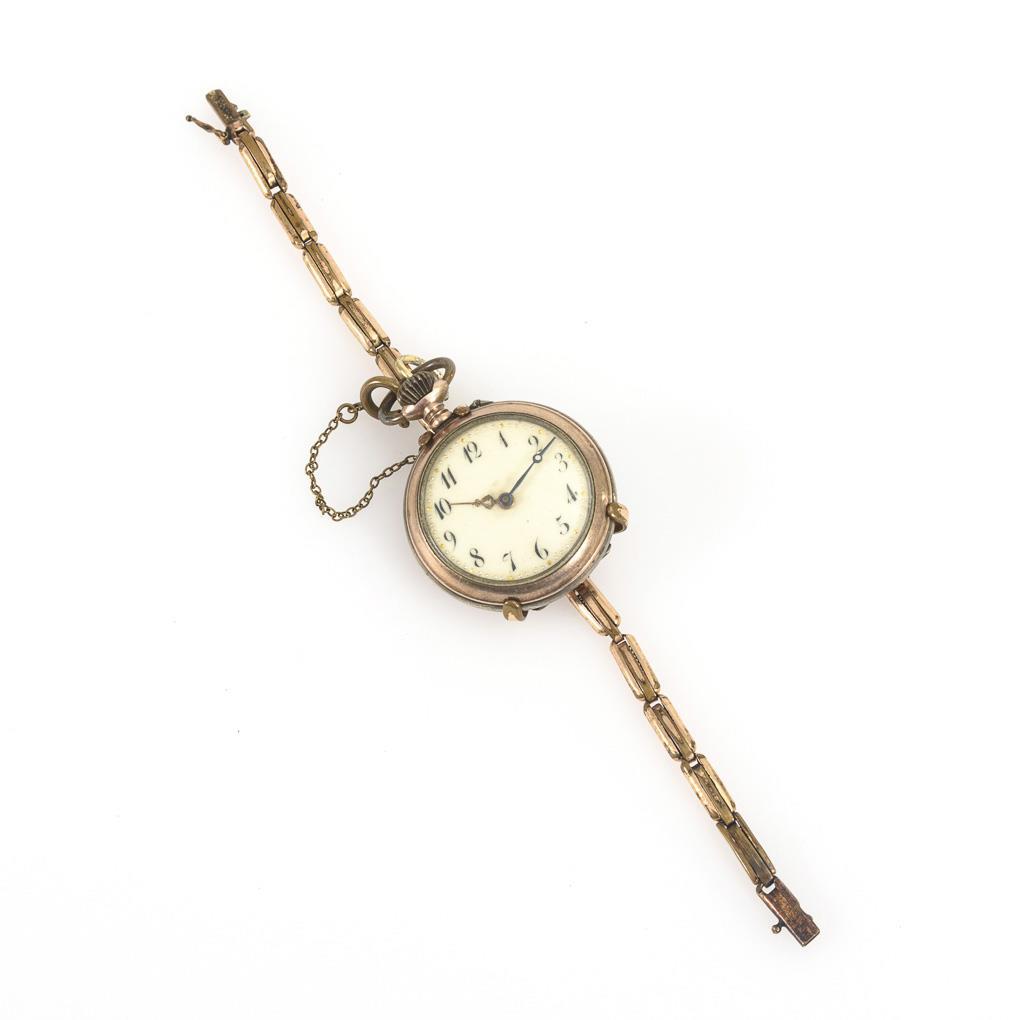 Galonné-Gehäuse mit guillochiertem Rückdeckel und leerer Wappenreserve. An vergoldetem Zuggliederarmband mit Zangenfassung und Sicherheitskette, L 16,5 cm. Alters- und Gebrauchsspuren, Rückdeckel nicht schließend.