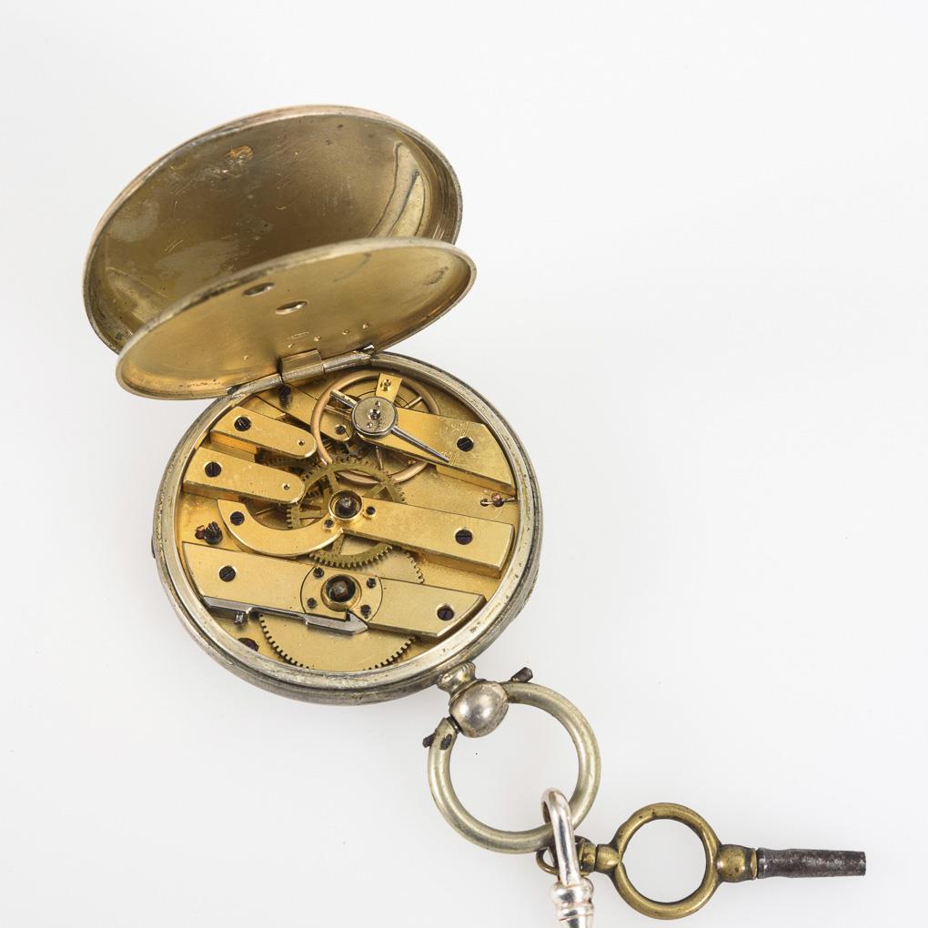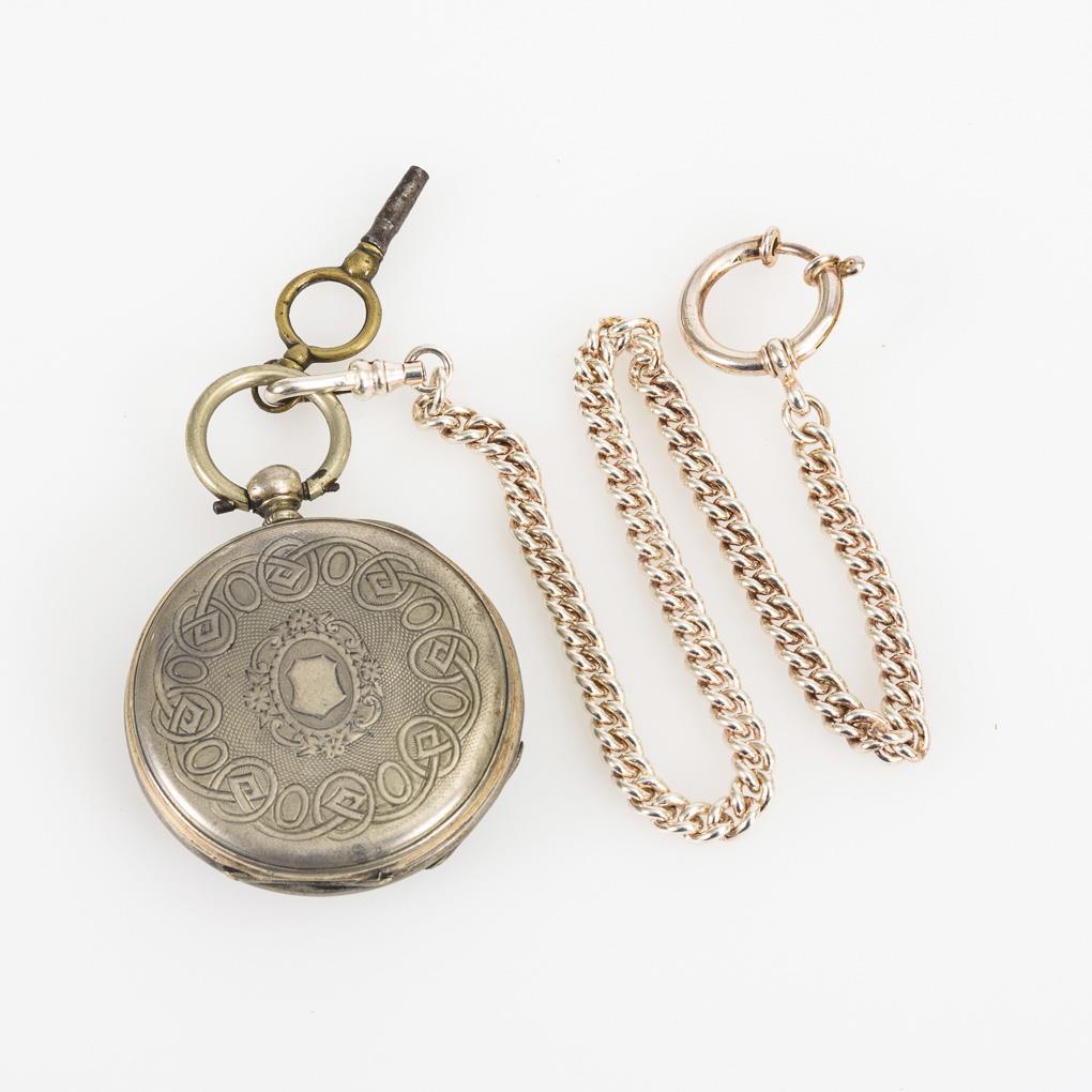 Lépine-Gehäuse mit guillochiertem und graviertem Rückdeckel mit leerer Wappenreserve. An jünger ergänzter 925 gepunzter Gliederkette mit Karabiner und großem Federring, L 29,5 cm. Leichte Alters- und Gebrauchsspuren, partiell kleine Defekte.