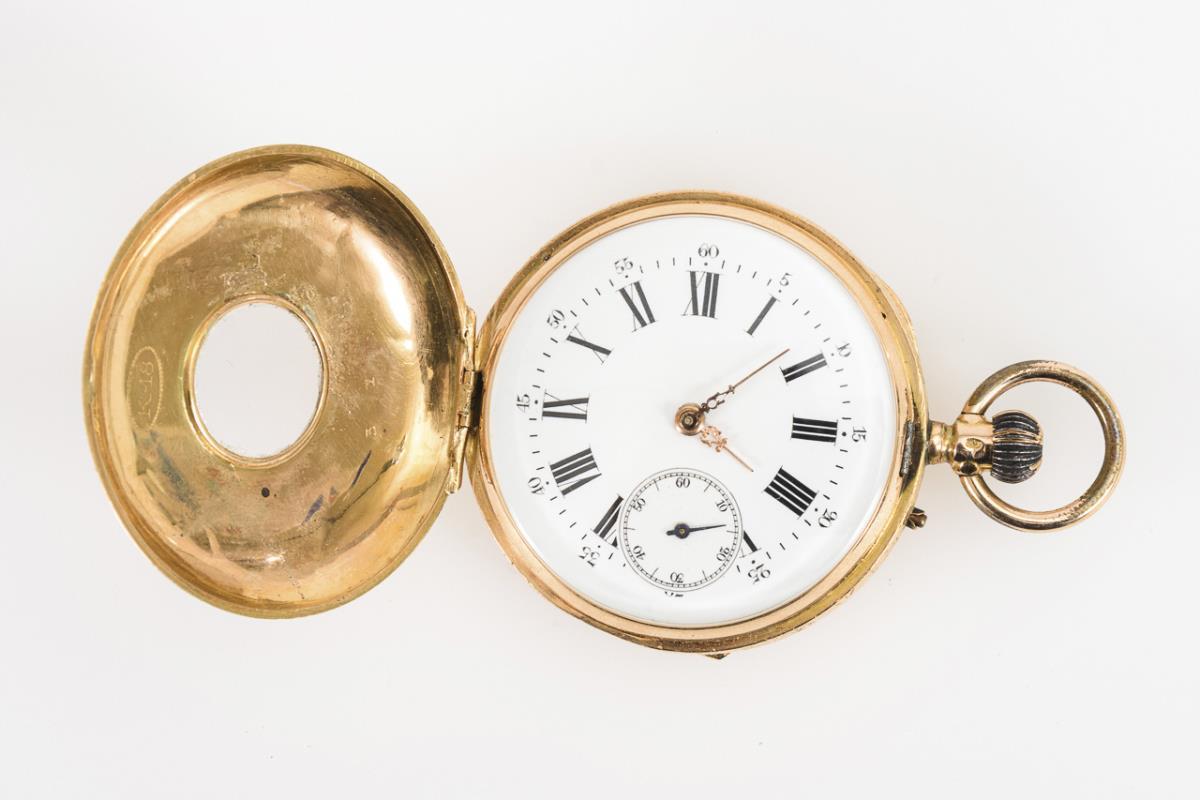18 k gepunzt, Beschauzeichen Helvetia, goldener Staubdeckel, bezeichnet "Dubois & C.". Ø 4 cm. 47 g.