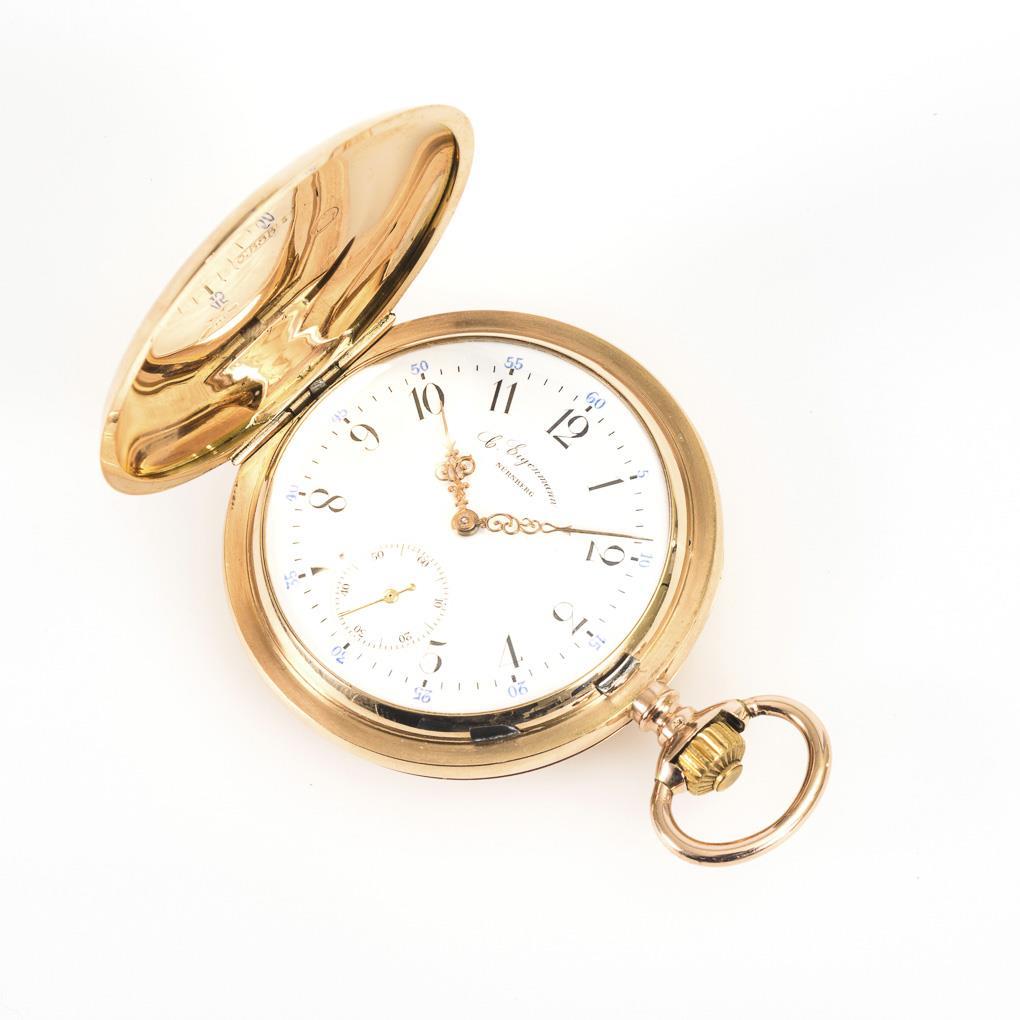 "C. Eigenmann Nürnberg" graviertes und "DB" gemarktes Dreiviertelplatinenwerk mit Ankerhemmung, gebläuter Breguet-Spirale, Schraubenkompensationsunruh, verschraubten Chatons, Kronenaufzug, läuft. Weißes Emailzifferblatt mit blauen und schwarzen arabischen Zahlen, Minutenkranz, kleiner Sekunde und Louis Quinze-Zeigern, bezeichnet "C. Eigenmann Nürnberg".