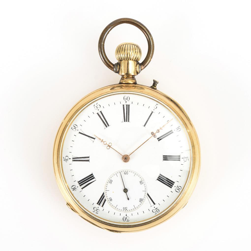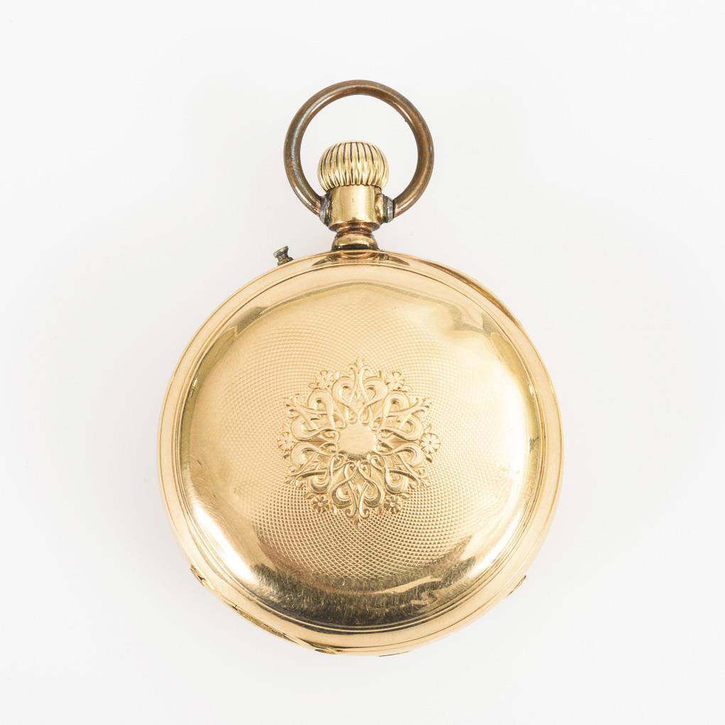 Lépine-Gehäuse mit guillochiertem Rückdeckel und graviertem Rosettenornament. Gehäuse gedellt und teils berieben, Zeigerstellung revisionsbedürftig.