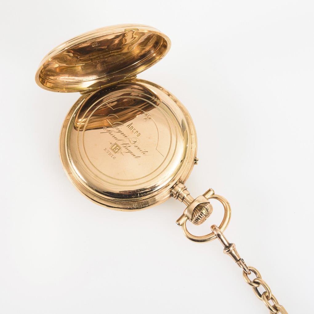 18 k gepunzt, Firmenmarke PF, goldener Staubdeckel. Uhr Ø 4,9 cm, 81 g. Kette L 28 cm, 27 g.
